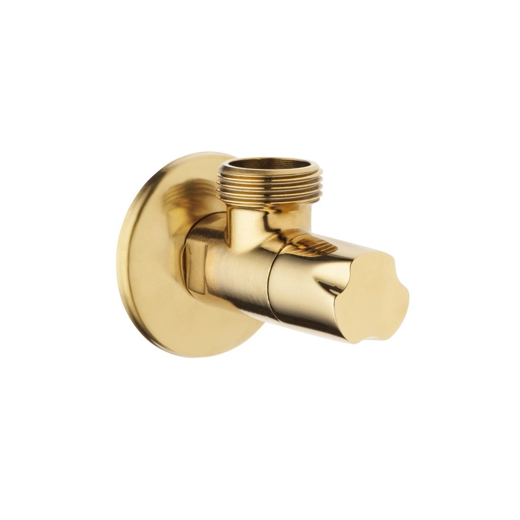 Mosazný úhlový ventil má keramickou hlavu, která zajišťuje těsnost a spolehlivost výrobku. Dekorační knoflík, maskovací růžice a zlatý lesklý povrch mu dodávají třídu a eleganci.