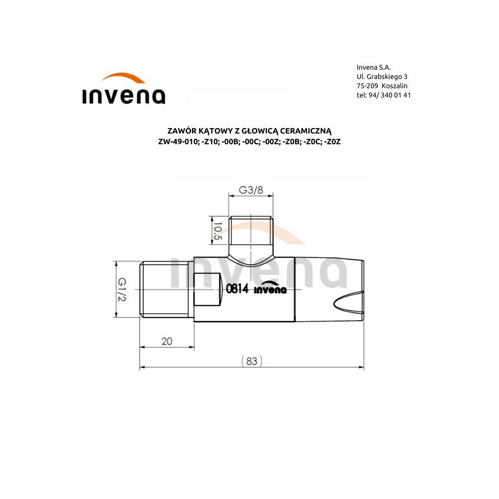 Invena, úhlový ventil s keramickou hlavou 1/2" X 3/8",bílá, INV-ZW-49-00B-W