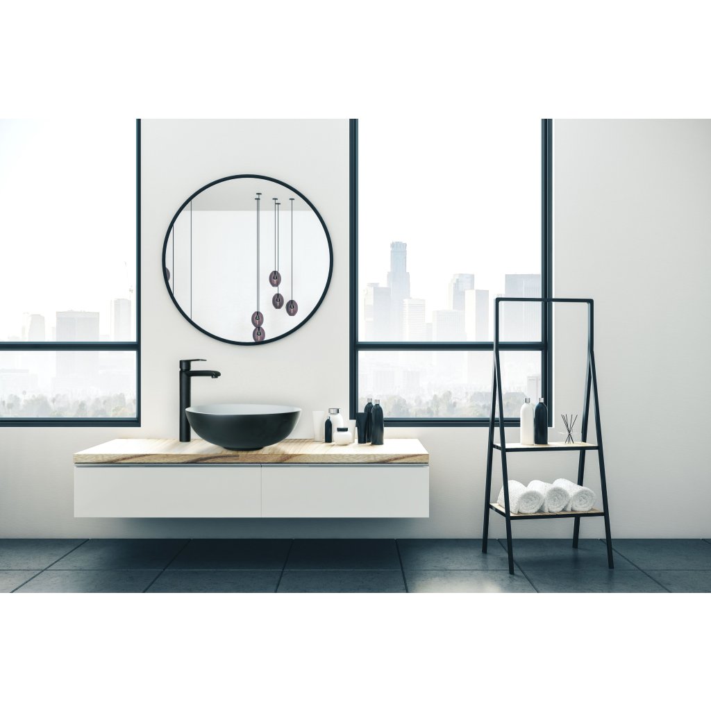 Kulaté keramické umyvadlo na desku o průměru 39,5 cm v atraktivní kombinaci černé a bílé barvy. Elegantní kontrastní design se hodí do moderních i minimalistických koupelen.