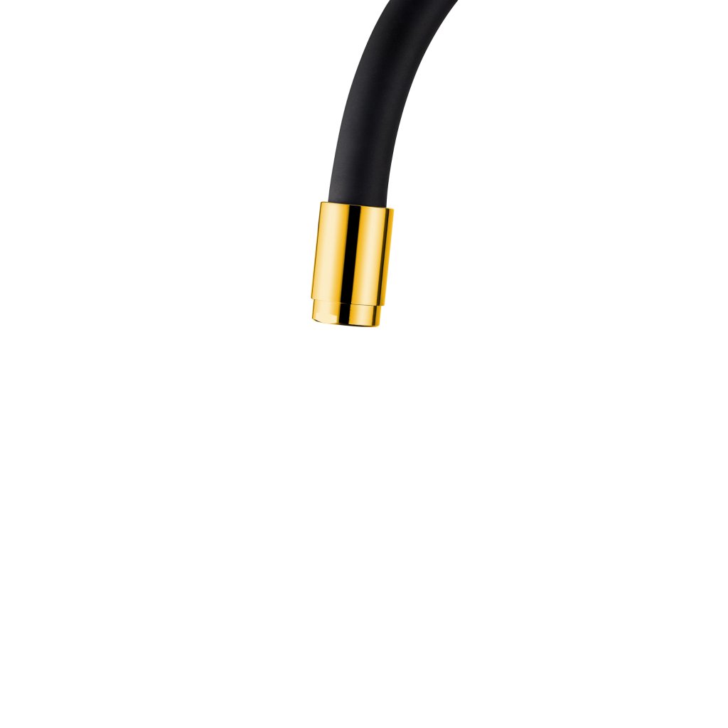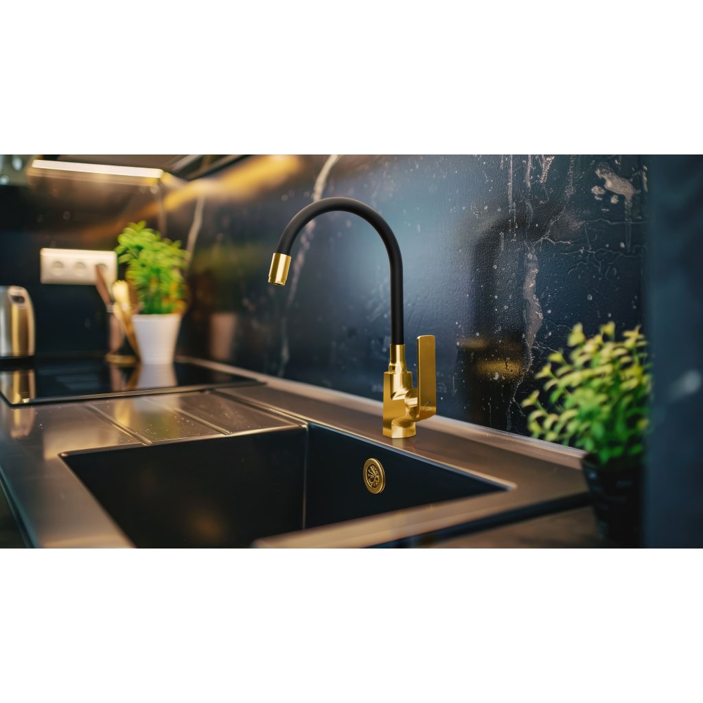 Invena Ligaria, vysoká dřezová baterie s elastickým ramenem, systém Eco Start, zlatá lesklá/černá matná, INV-BZ-39-009-L