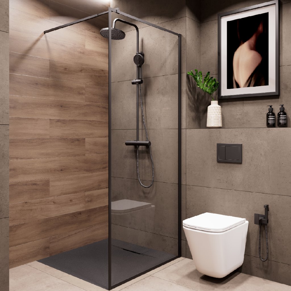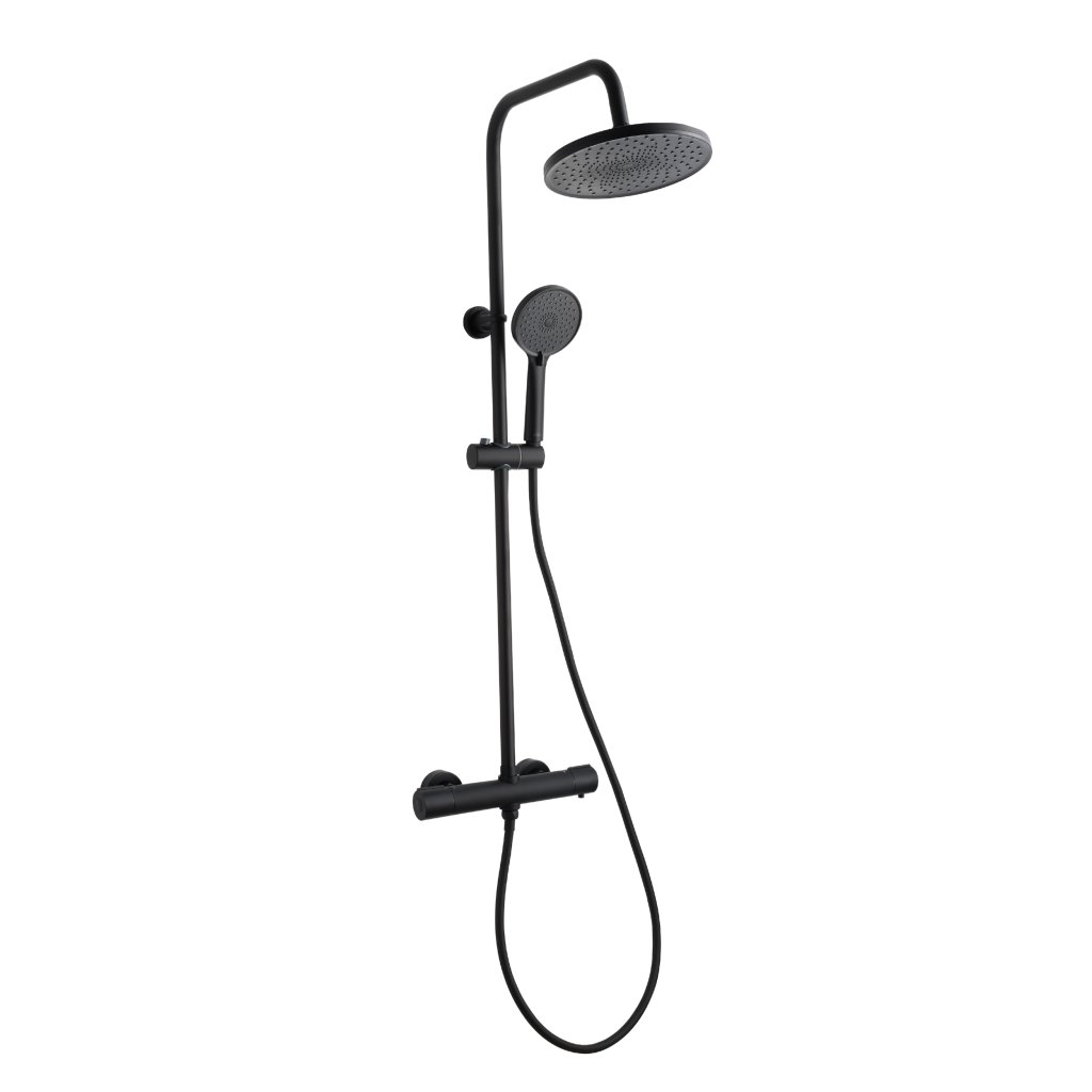 Tento model reprezentuje moderní sprchovou soupravu se sloupem a termostatickou baterií. Je navržen pro montáž na zeď a klade důraz na komfort, bezpečnost a estetiku v koupelně. Má černý matný povrch, což z něj činí stylový doplněk moderní koupelny s minimalistickým nebo industriálním designem.