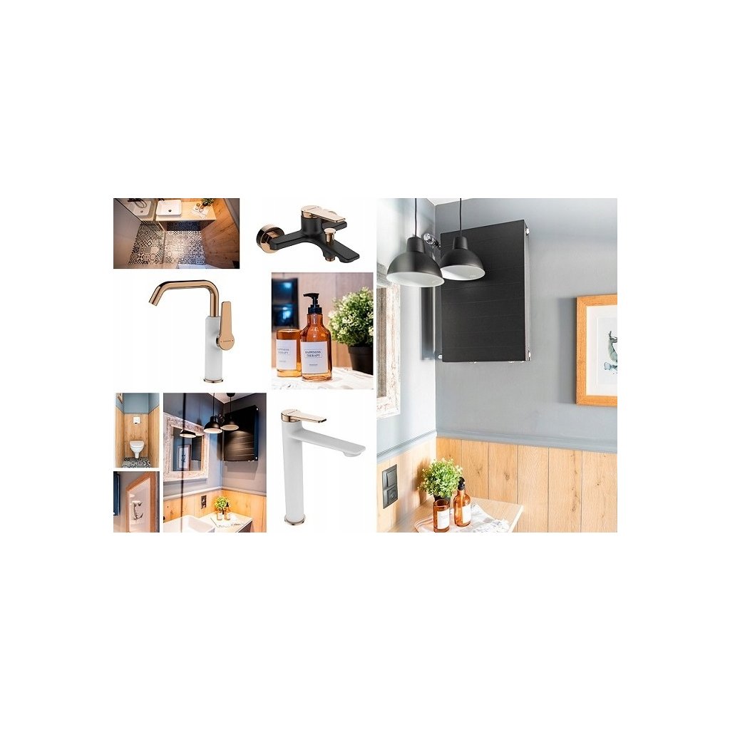 Série baterií s jemnými tvary Alanis je krokem k současným trendům. Série obsahuje kromě standardních koupelnových baterií také zápustnou umyvadlovou baterii a umyvadlovou baterii s výtokem ve tvaru L a boční pákou. Koupelnové baterie jsou stejně jako kuchyňské dostupné v bílé nebo černé barvě. Na druhé straně, páky a rozety baterií (v některých modelech a výtocích) byly dokončeny v růžovém a žlutém zlatě. Takový efekt umožní nádech modernosti v interiéru. Bude to perfektní volba pro koupelnu ve stylu New York nebo glamour. Umyvadlové baterie se dodávají v kompletně chromovém, černém a zlatém provedení.