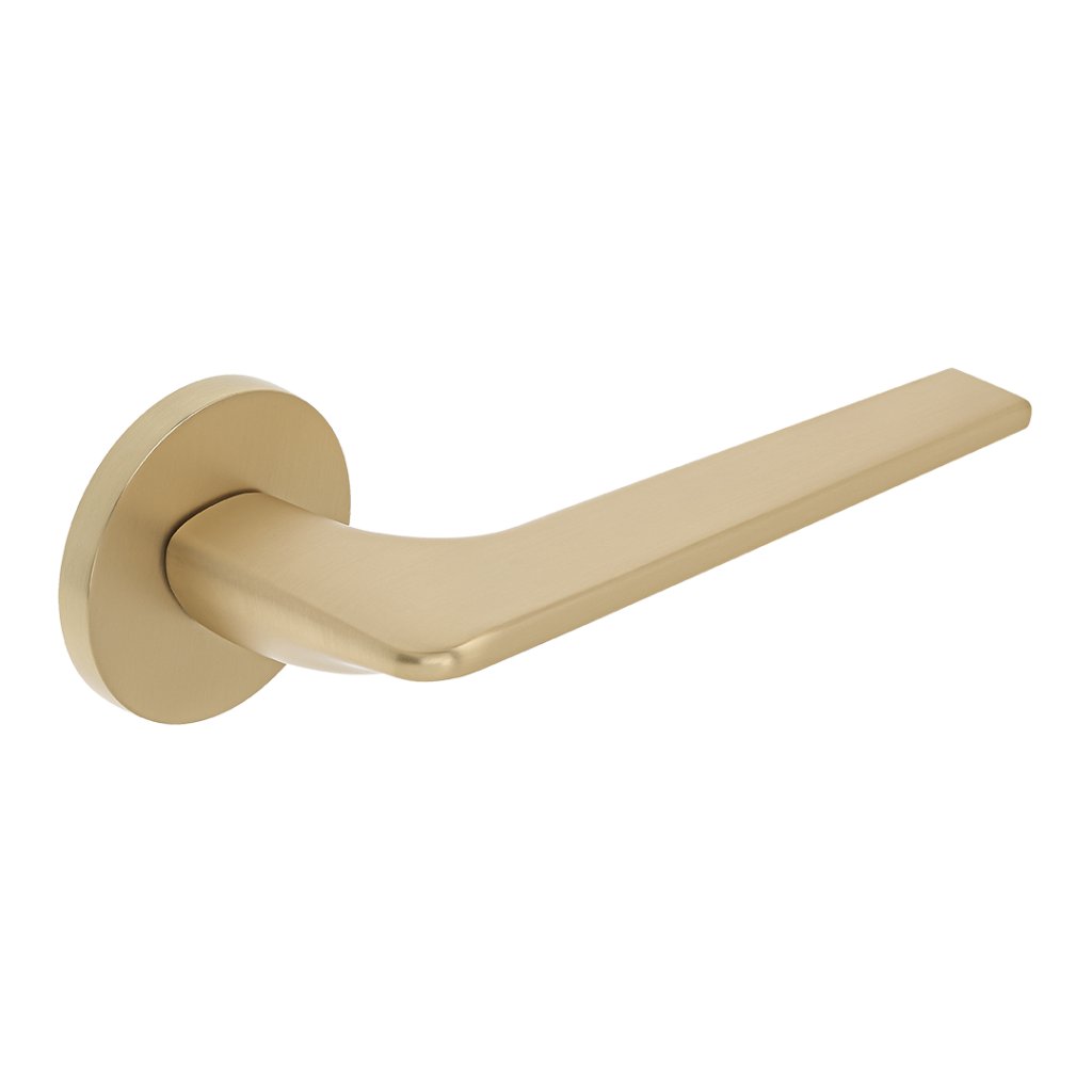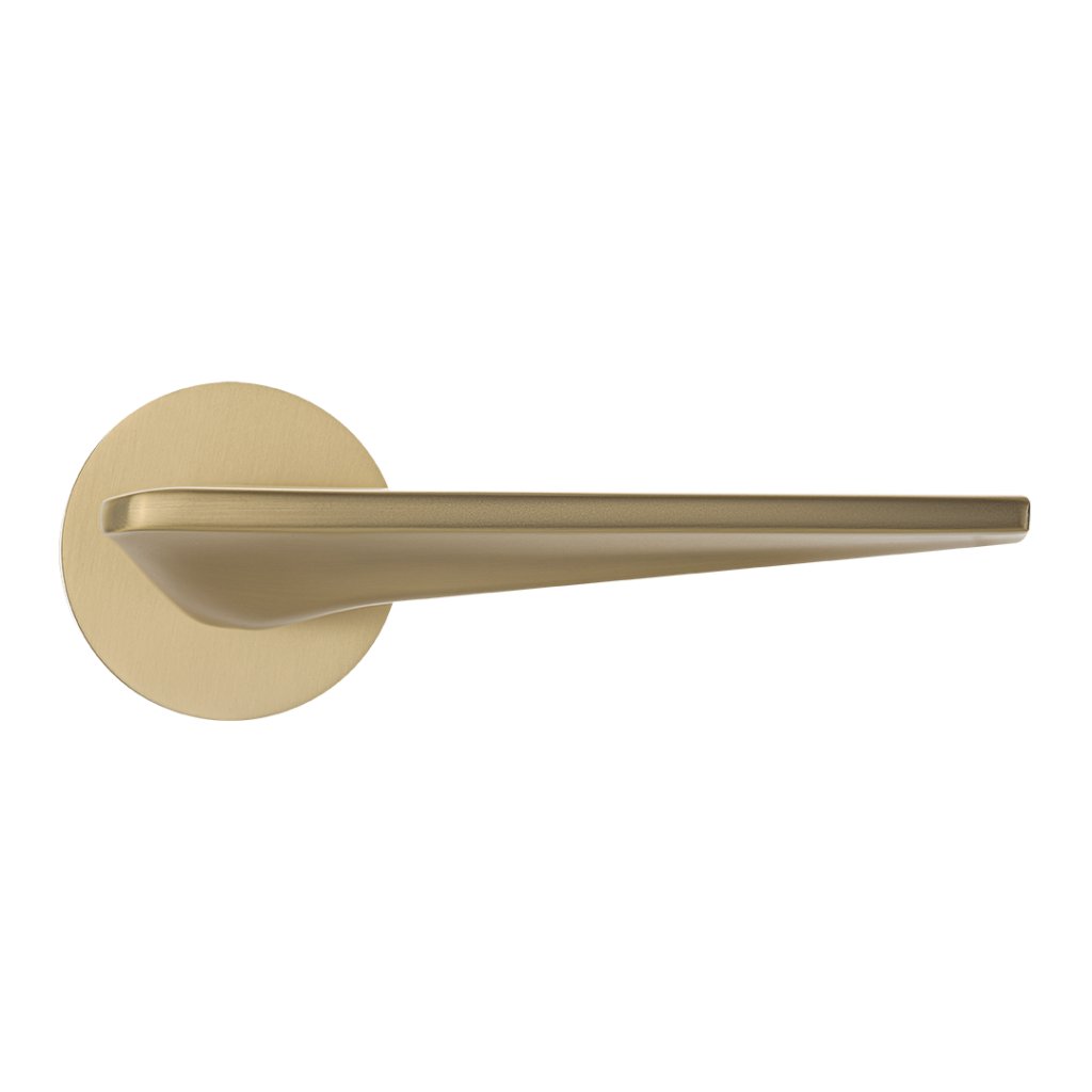 Klika Celestrie z kartáčovaného zlata je dokonalým příkladem harmonie mezi moderním designem a elegancí. Kulatá, štíhlá rozeta a ergonomická rukojeť vytvářejí jemný tvar, který upoutá pozornost, zatímco její jemná textura z broušeného zlata dodá každému interiéru hřejivý a luxusní nádech.