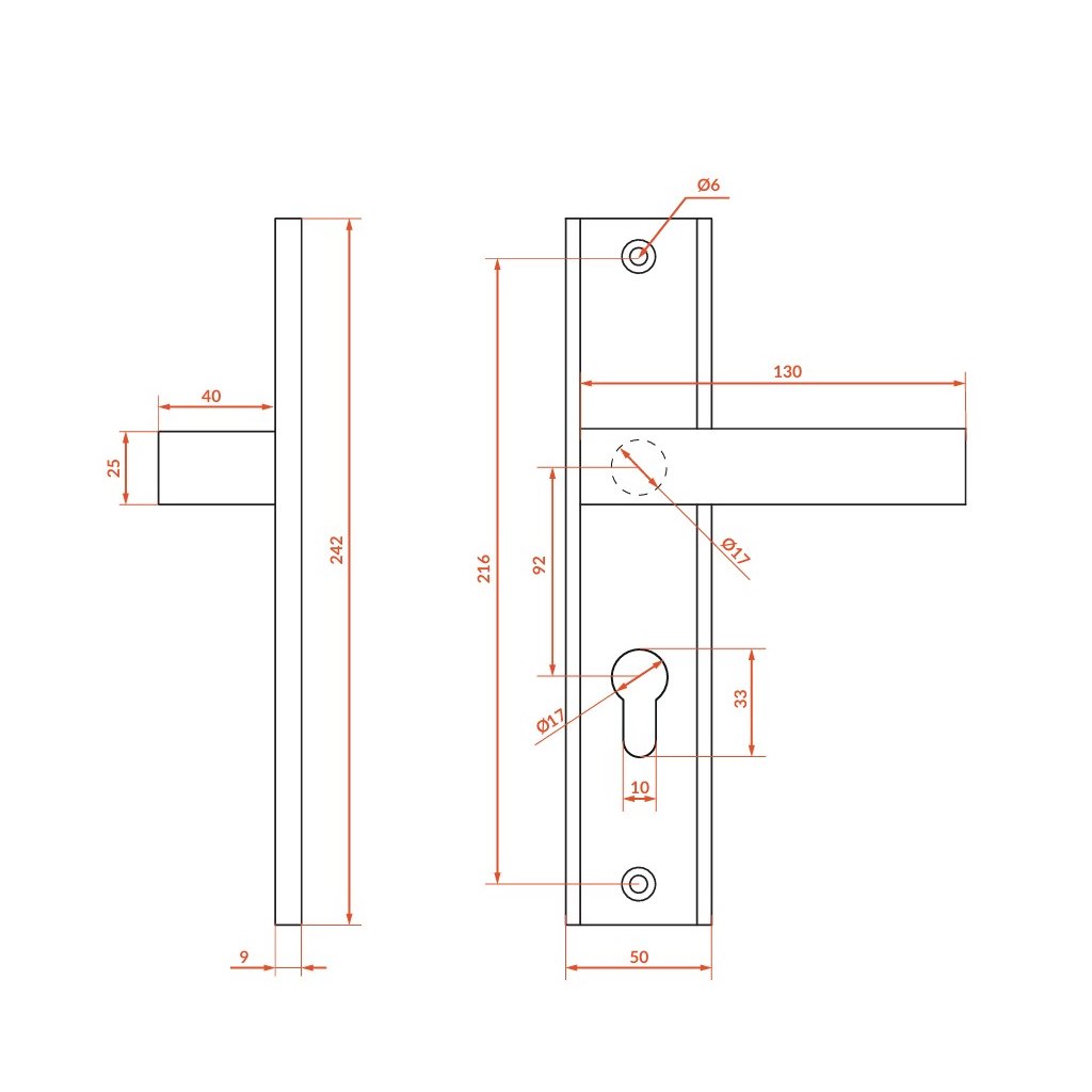 Při objednávání klik na dlouhém kování je třeba vědět vzdálenost mezi osou kliky a osou klíče (rozteč). Standardní vzdálenost je 72 nebo 90 mm. Zároveň jsou dostupné 3 hlavní otvory pro klíč (interiérový klíč, otvor pro cylindrickou vložku, WC klíč)