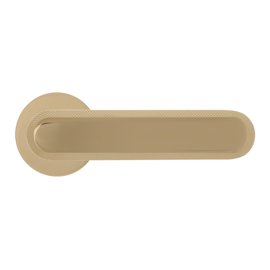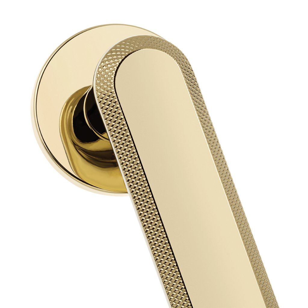 Rugos klika ve zlaté barvě je návrh, který spojuje nadčasovou eleganci s moderním přístupem k designu. Jeho jedinečná oválná rukojeť s jemnými střihy podél okrajů, které připomínají jemné šperkové dekorace, mu dodává jedinečný charakter. Je to detail, který nejen upoutá pozornost, ale také umocní jedinečný vzhled dveří, díky čemuž jsou sofistikovanější a elegantnější. Hladká, minimalistická středová část rukojeti dokonale kontrastuje s ozdobnými hranami a přináší designu lehkost a jednoduchost.