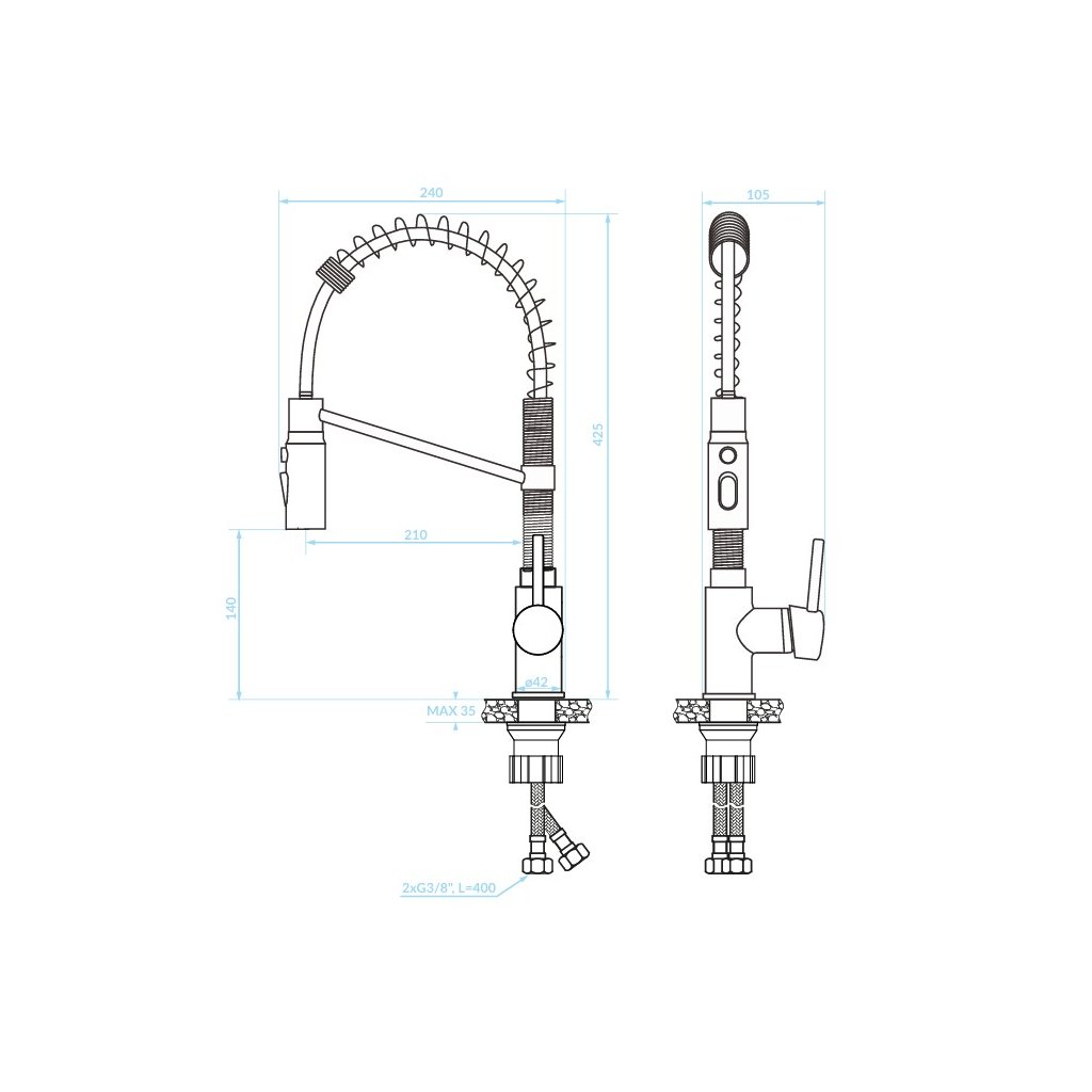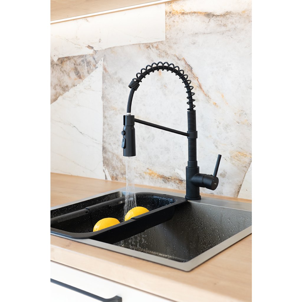 Flexibilní výtok, opletený pružinou, poskytuje naprostou volnost pohybu a přesnou kontrolu proudu vody, což výrazně usnadňuje každodenní činnosti v kuchyni. Mytí nádobí, oplachování zeleniny a ovoce se stává jednodušším a pohodlnějším a plná kontrola nad průtokem vody zvyšuje pohodlí při používání.