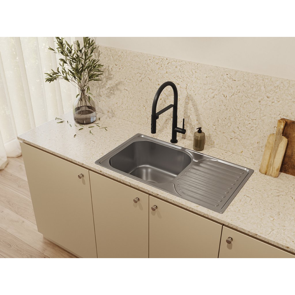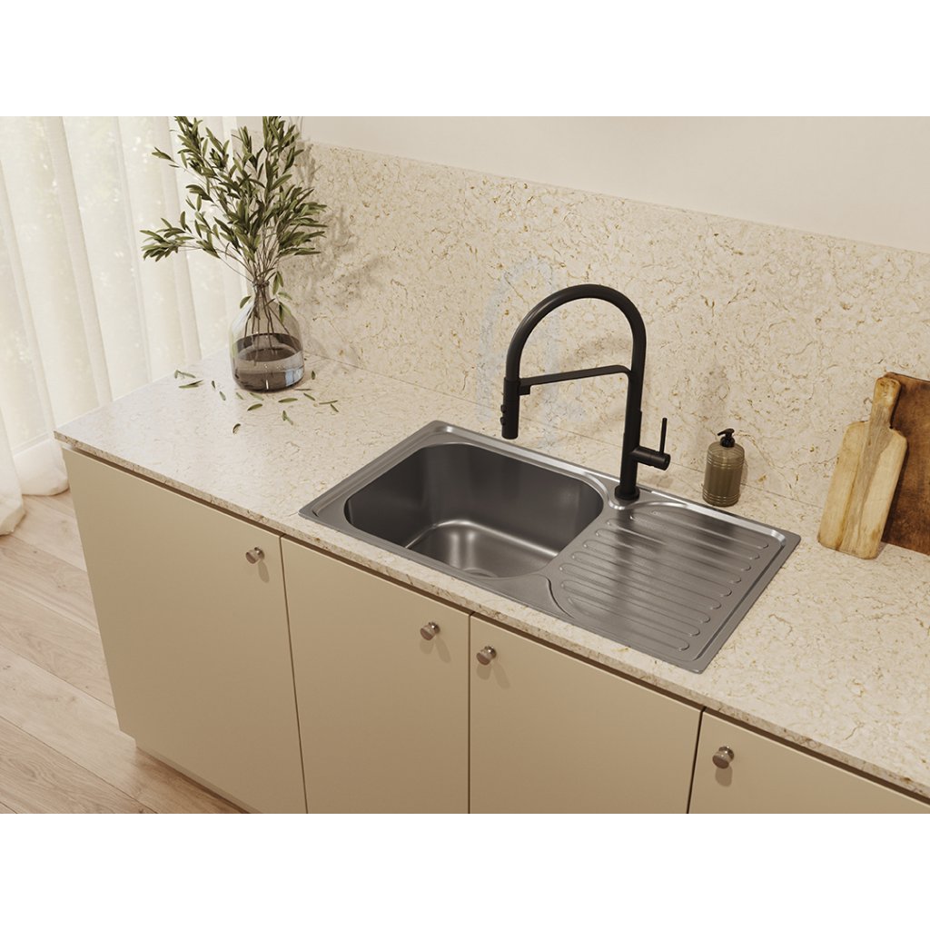 Dřezová baterie Siluetto v černé barvě je kombinací moderního designu, funkčnosti a úspory vody. Díky svému jemnému, štíhlému tvaru dokonale zapadá do požadavků moderních kuchyní a spojuje eleganci s bezkonkurenčním komfortem používání. Klíčovým prvkem baterie Siluetto je flexibilní výtok s magnetickým montážním systémem, který umožňuje volný a přesný pohyb proudu vody tam, kde je to nejvíce zapotřebí. Ať už myjete velké nádobí, oplachujete zeleninu nebo plníte vysoké nádoby, flexibilní výtok se přizpůsobí vašim potřebám pro maximální pohodlí. Baterie Siluetto nabízí dva režimy proudu vody: nepřetržitý a dešťový, které lze snadno přepnout stisknutím tlačítka. Nepřetržitý režim je ideální pro každodenní standardní úkoly, jako je mytí nádobí nebo nalévání vody, zatímco režim deště je ideální pro mytí větších nádob nebo oplachování potravin. Díky této funkci poskytuje baterie optimální řešení v každé situaci.