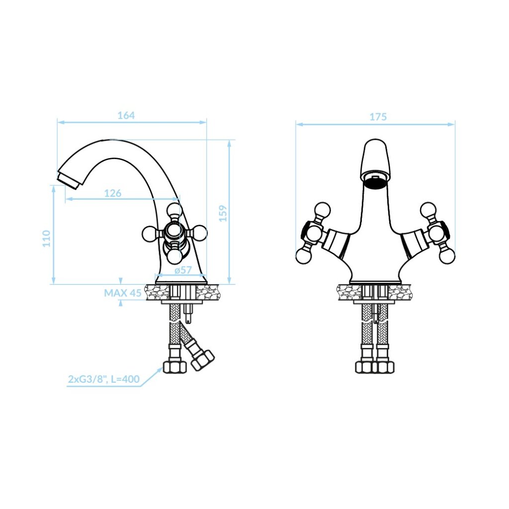 Volně stojící baterie Stilo je model se dvěma rukojeťmi s pevným výtokem o dosahu 127 mm a provzdušňovačem o velikosti 24 mm. Umožňuje vám pohodlné používání umyvadla a zároveň snižuje množství spotřebované vody a tím vám umožňuje optimalizovat účty. Dvoupákové umyvadlové baterie se snadno používají. Dvě ergonomicky tvarované rukojeti ve tvaru kříže vám umožňují pohodlně ovládat intenzitu proudu a regulovat jeho teplotu.