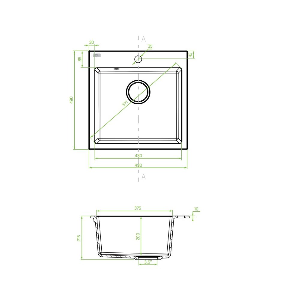 Laveo Alena, 1-komorový granitový dřez 490x490x215 mm, černá, LAV-SBA_710B