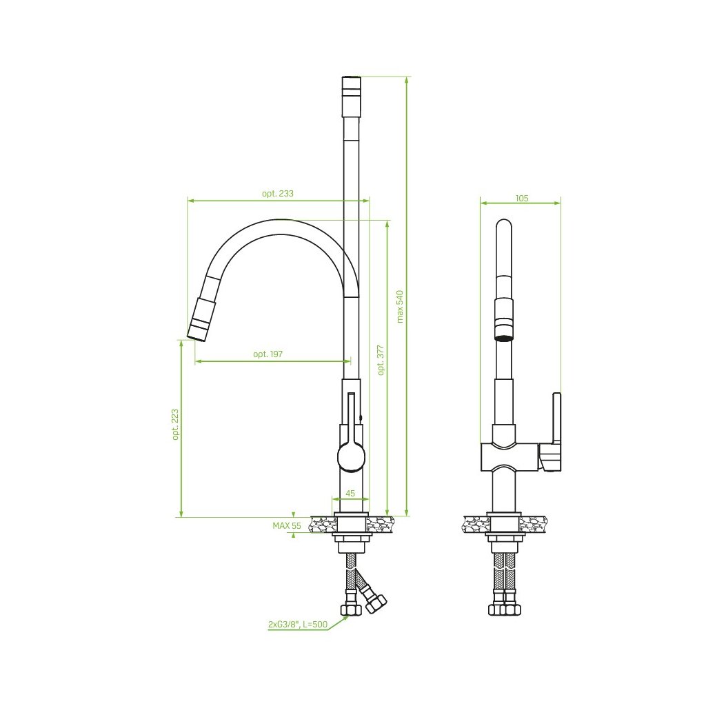 Tato moderní dřezová baterie z kolekce „Alita“ přináší spojení funkčnosti, flexibility a estetického designu. Elastické rameno umožňuje pohodlné otáčení a manipulaci při mytí nádobí či plnění vysokých nádob. Přepínatelné dva režimy proudu – klasický a sprchový – usnadňují každodenní práce v kuchyni. Černá matná povrchová úprava dodává baterii výrazný moderní vzhled, zatímco jednopákové ovládání a keramická kartuše o průměru 25 mm zajišťují spolehlivý a pohodlný provoz. Funkce ECO s průtokem ≤ 9 l/min pomáhá šetřit vodu bez omezení komfortu.