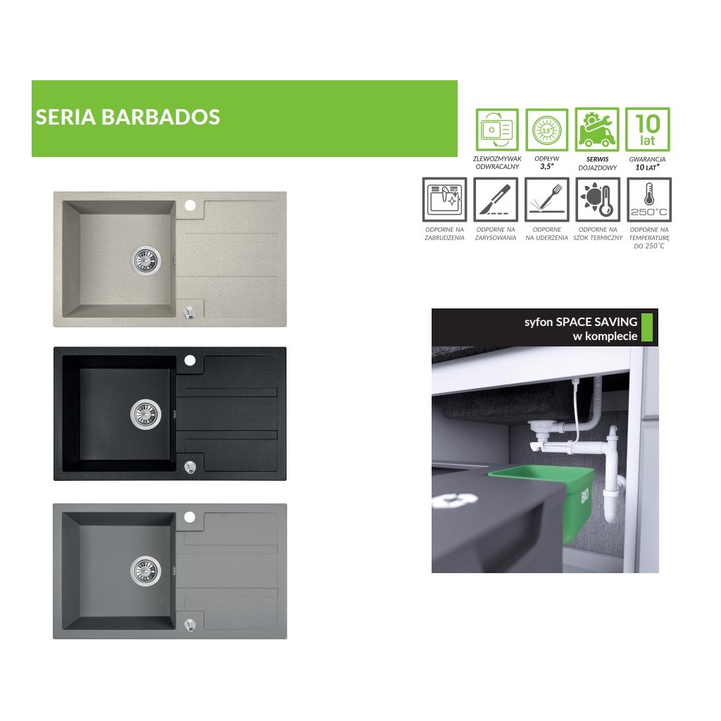 Dřezy Barbados od Laveo jsou inovativní produkty vyrobené ze žuly, díky čemuž jsou odolné nejen vůči znečištění, ale také poškrábání, teplotním šokům či teplotám až do 250°C. Jak tedy nainstalovat takové téměř nezničitelné produkty? Jejich instalace nebude problémová – tyto modely mají z výroby vyříznuté otvory pro baterii. Použitý materiál v kombinaci s designem činí produkty strohým a jemným zároveň. Jednoduchá, poměrně geometrická forma a tónované barvy se budou skvěle hodit do klasických i modernějších prostor. Tyto elegantní dřezy s jednou komorou jsou vybaveny odkapávači, které jistě poslouží v domácnostech milovníky vaření. Dřezy Barbados od Laveo jsou dostupné ve třech nadčasových barevných variantách: béžové, šedé a černé. Značka přesvědčená o pozoruhodné odolnosti svých produktů poskytuje k jejich používání 10letou záruku.
