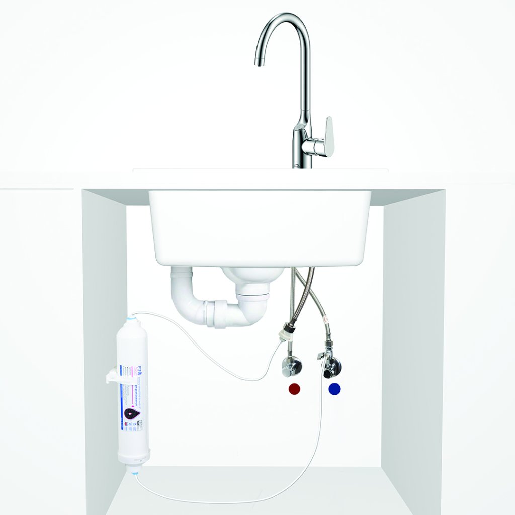 Filtr se vyznačuje kompaktními rozměry, takže zabírá málo místa pod skříňkou. Sada obsahuje všechny prvky potřebné pro montáž: tričko s ventilem, pružnou hadici, montážní konzolu, karbonovou lineární vložku, rychlospojku a pojistné kroužky (3 ks), které zajišťují rychlé a pohodlné uvedení systému do provozu.