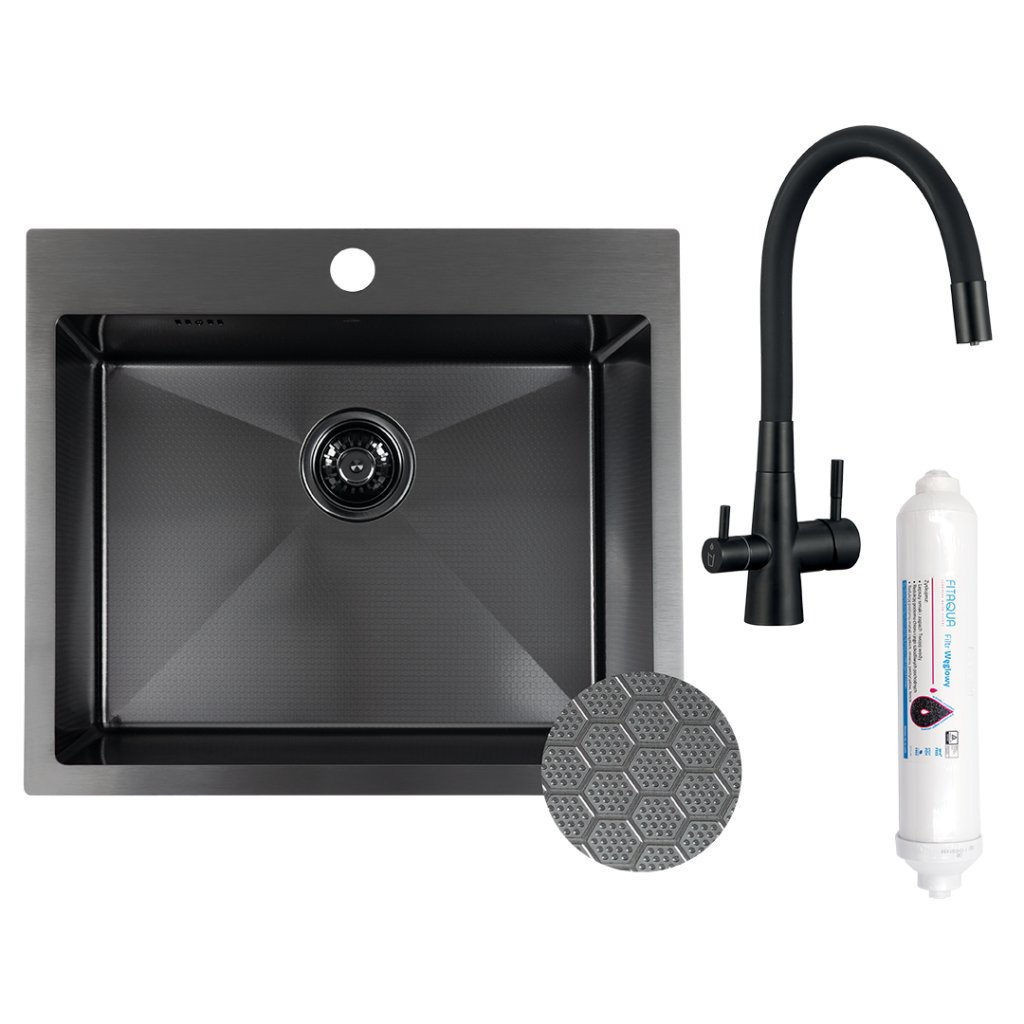 Laveo Malawi, 1-komorový nerezový dřez 580x500x200 mm s kuchyňskou baterií s připojením na filtr vody, černá, LAV-SLMA710F