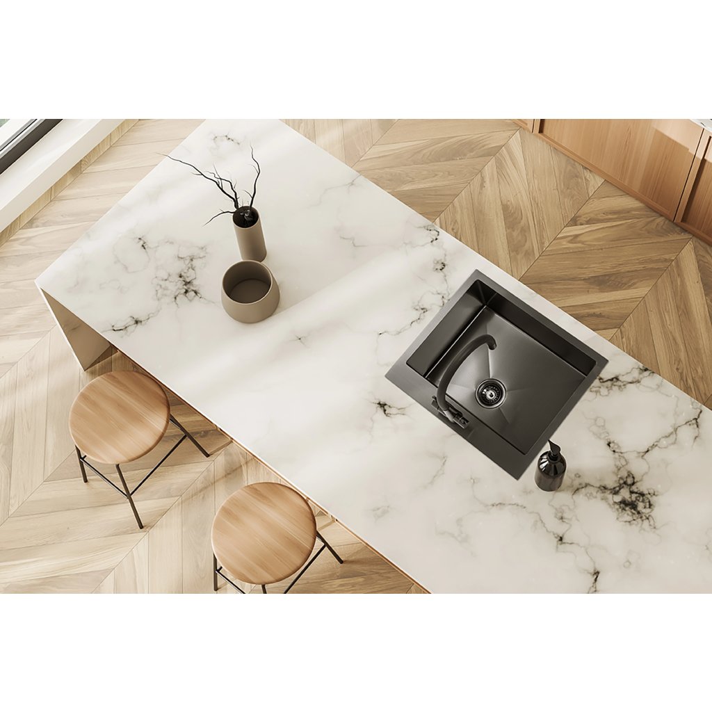 Instalace v jedné rovině s deskou – Dřez je namontován na úrovni povrchu pracovní desky, čímž vytváří jednotnou linii, která dodává kuchyni moderní a minimalistický vzhled. Silikonem chráněný okraj kolem dřezu zajišťuje efektivní odvádění vody do odtoku.