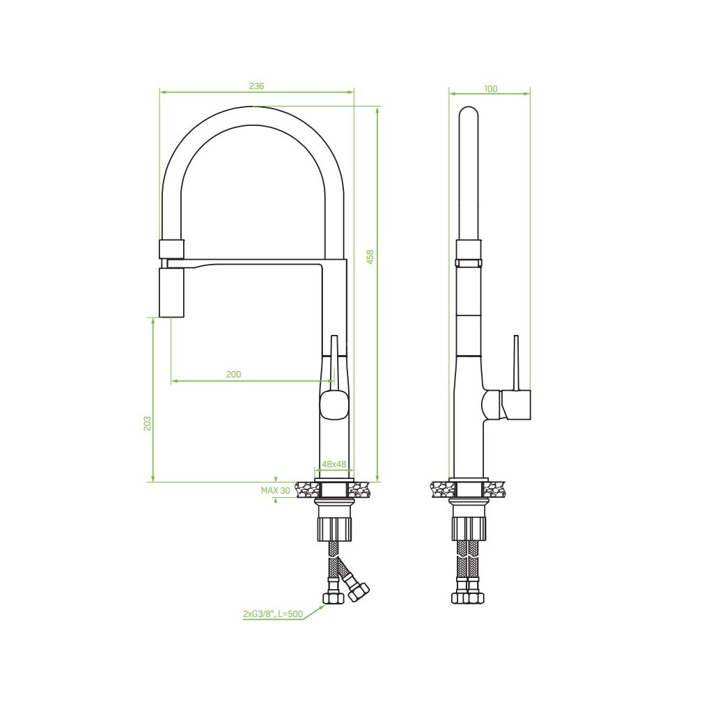 Flexibilní pryžový výtok rozšiřuje dosah baterie a usnadňuje každodenní práce, jako je mytí nádobí, oplachování zeleniny a ovoce nebo plnění velkých jídel vodou. Výsledkem je, že baterie Pola poskytuje pohodlí a všestrannost, což z ní činí ideální volbu pro různé typy dřezů – jednokomorové i větší modely s odkapávačem.