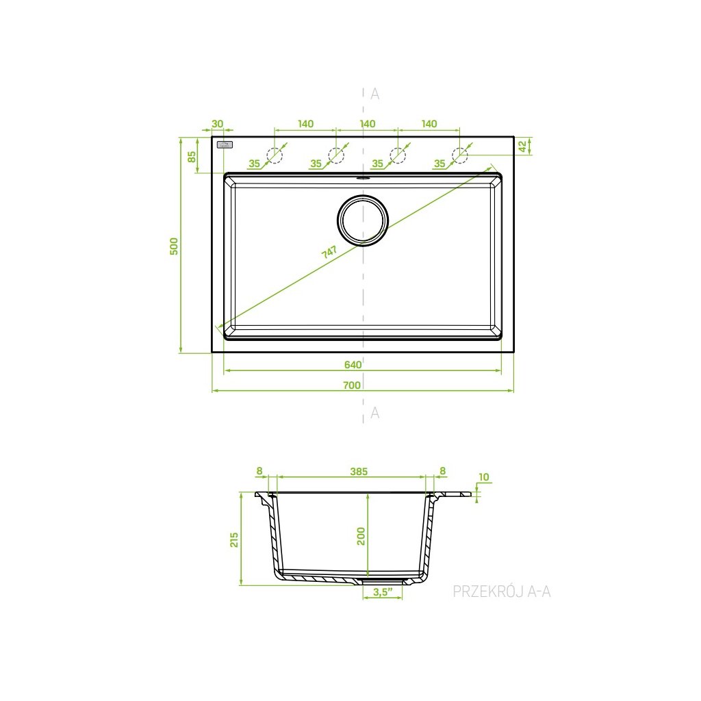- Typ: 1-komorový granitový dřez bez odkapávače