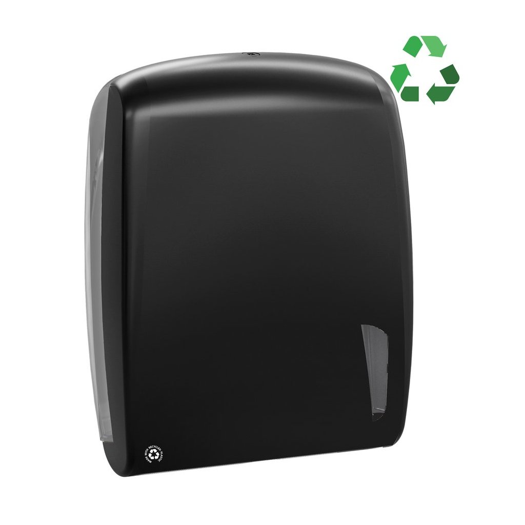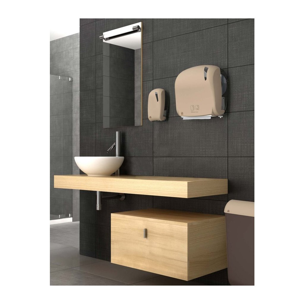 Kolekce SKIN pro veřejné prostory zahrnuje kompletní výběr koupelnových doplňků, které se vyznačují moderním designem. Doplňky v barevném provedení černá a písková jsou vyrobeny z recyklovaného plastu.