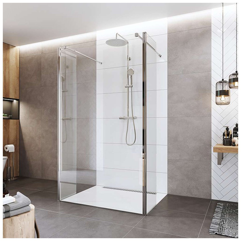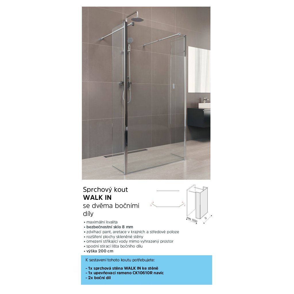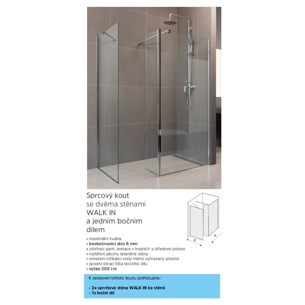 Boční stěna s profilem k sprchovým stěnám WALK IN s možností polohování. Součástí bočního dílu je rohový profil s pantem, který umožňuje částečně uzavřít sprchovací prostor, nebo rozšířit délku sprchovací stěny WALK IN- maximální kvalita