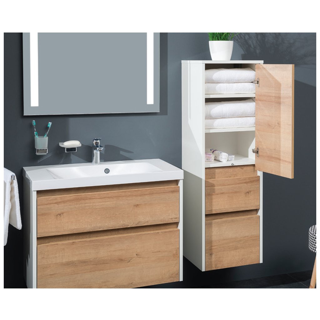Jednoduchost, efektivnost, elegance. To jsou hlavní společné jmenovatele koupelnového nábytku, který ozdobí každou koupelnu. Hrany skříněk jsou laserově opracovány. Skříňka obsahuje 2 zásuvky a dvířka za kterými se ukrývají 2 police. Vybírat můžete ze 2 typů otevírání (levé, pravé) a mnoha barevných odstínů: Multidecor. Skříňka se dodává ve složeném stavu.Doplňkové parametry