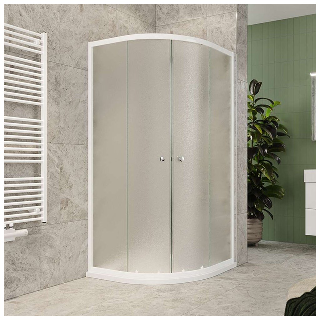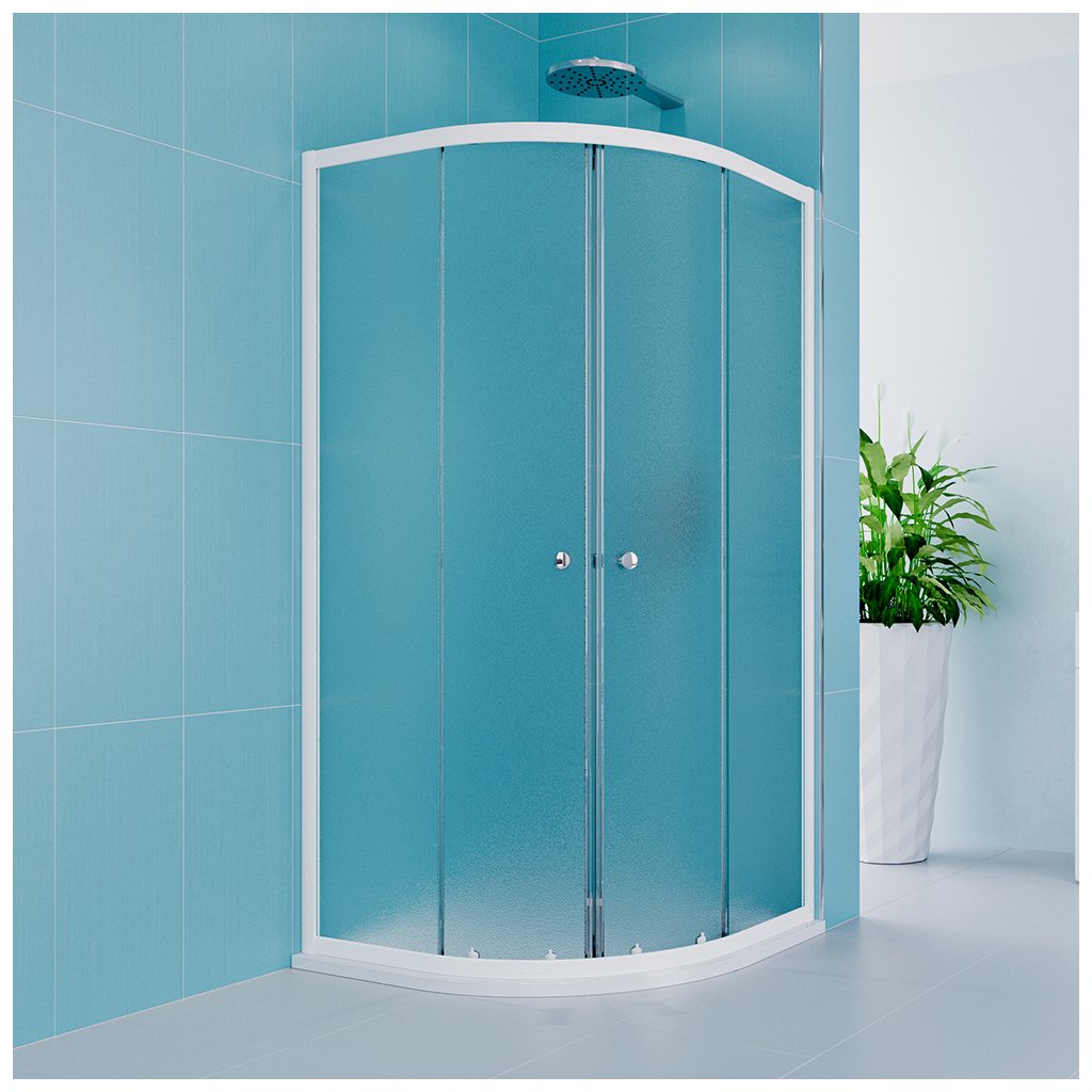 Tloušťka bezpečnostního skla je 4 mm. V provedení Grape sklo a bílý ALU profil.Sprchový kout je osazen posuvnými dveřmi, které mají ložiskové pojezdy s excentrickým usazením (možnost perfektního seřízení). Dorazy zajišťují minimální nárazy při otevírání a zavírání sprchového koutu.