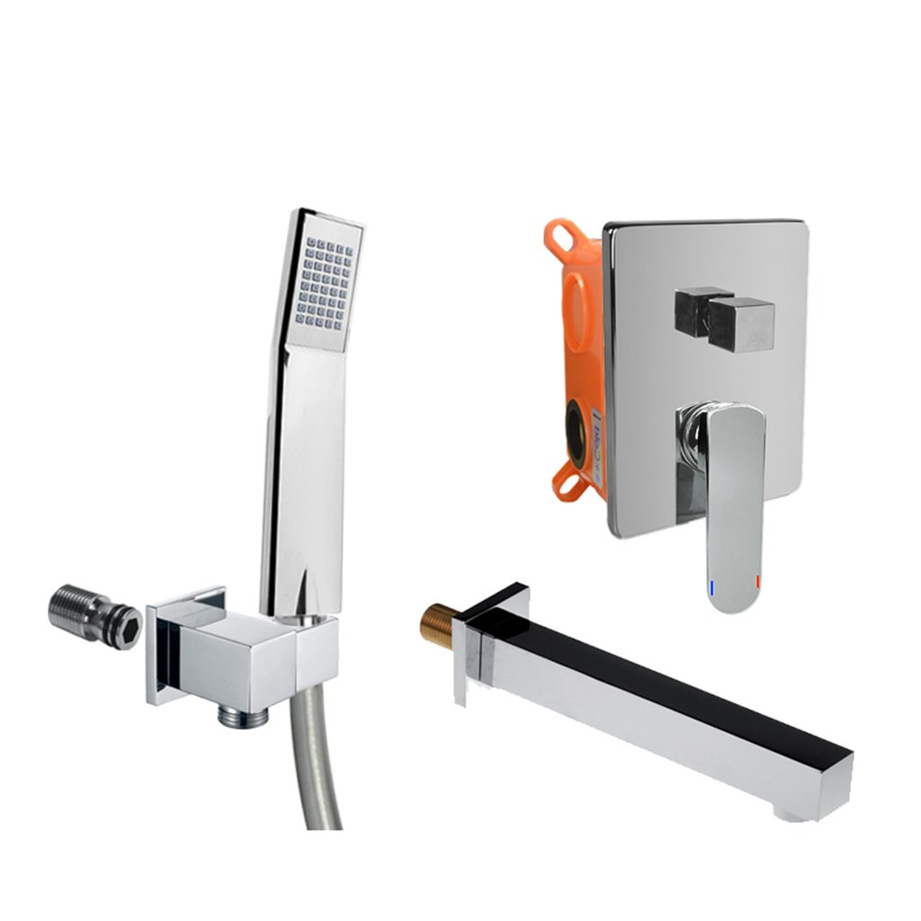 Dvoucestná podomítková baterie s keramickým přepínačem, Mbox, hranatý kryt, vývod s držákem sprchy, šedostříbrná hadice 150 cm, jednopolohová ruční sprcha, vanové napouštěcí ramínko.10 let záruka na baterii.