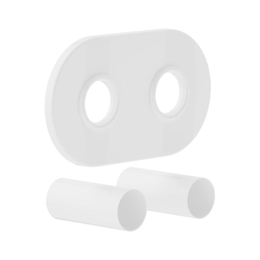 Souprava dvojité, kulaté rozety s trubkami je určena k maskování radiátoru, spodního, kombinovaného, dekorativního spojení. Připojení k instalaci z PEX a měděných trubek. Rozeta má 2 otvory pro procházející spoje radiátoru s roztečí 50 mm. Maskovací rukávy o délce 50 mm se hodí do spojovací trubice o průměru 16 mm - PEX a 15,18 mm - měď. Speciálně použitý správný typ mosazi, ze které byla pouzdra vyrobena, usnadňuje jejich zkrácení na správnou délku. Rozeta z nerezavějící oceli potažená barvou je dvakrát chráněna proti korozi kondenzace.