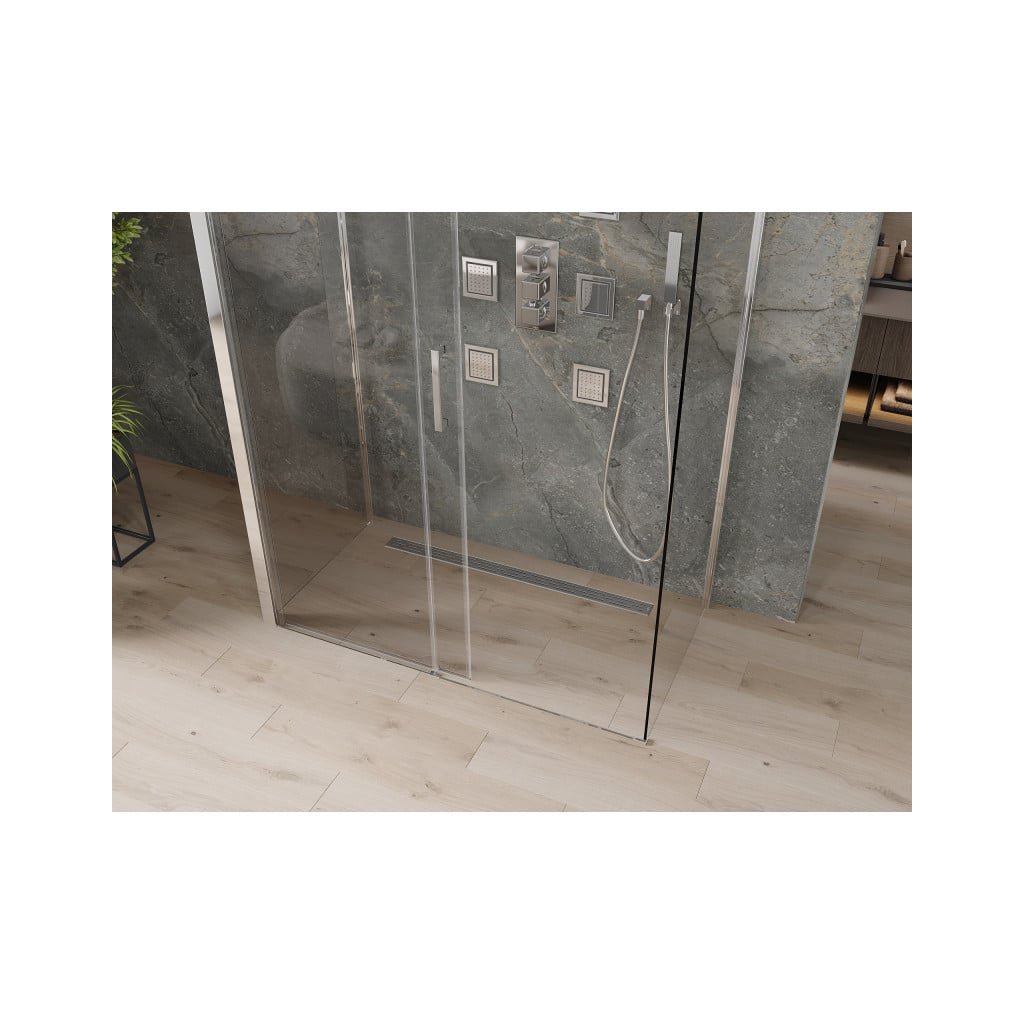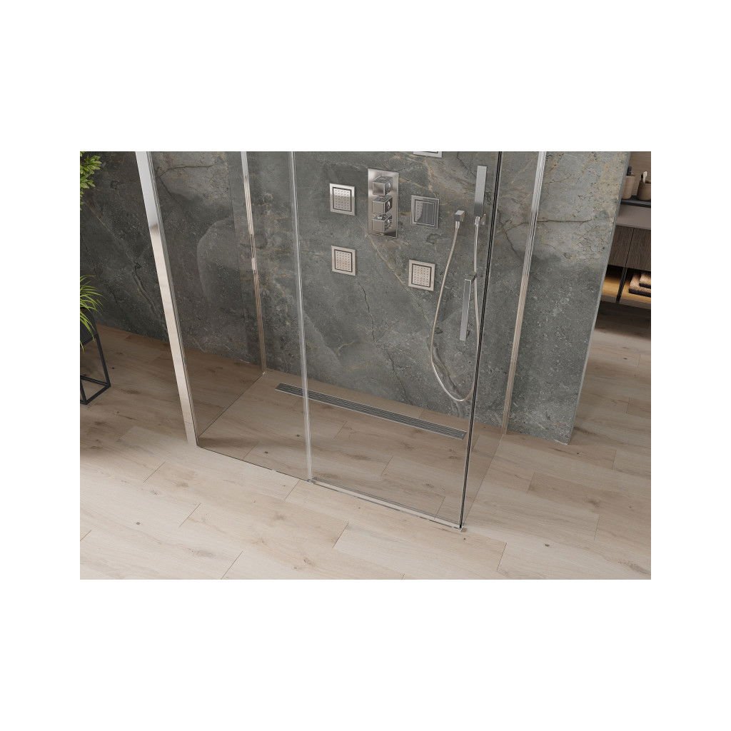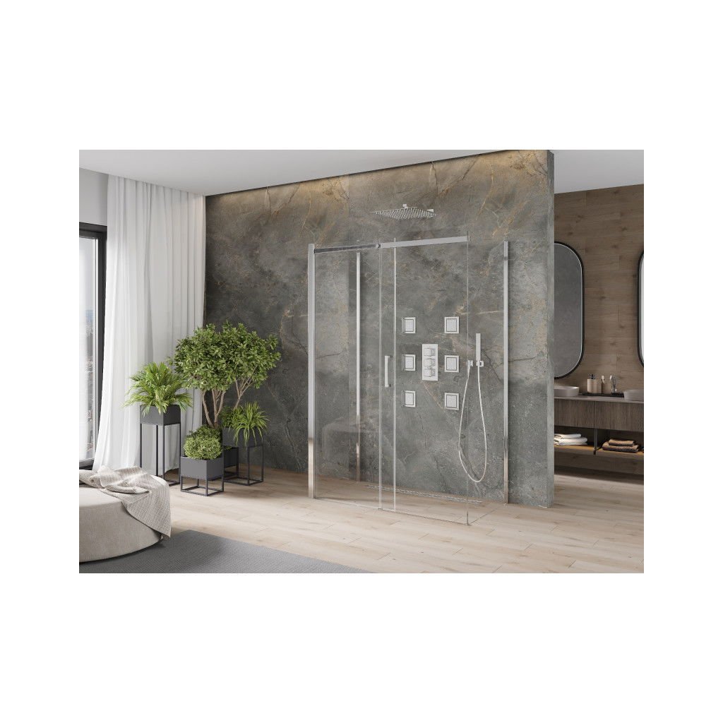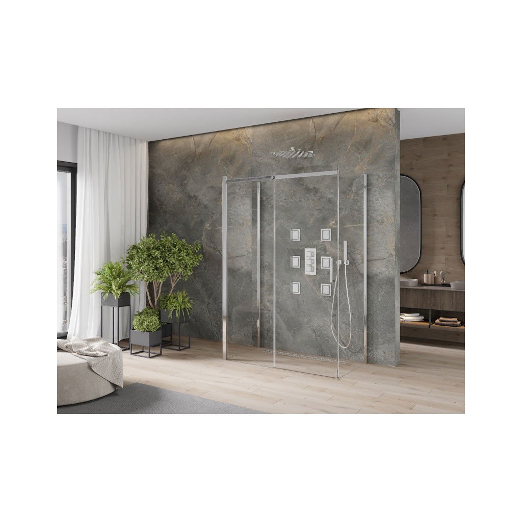 Skvělá volba do každé koupelny. Exkluzivní sprchový kout je vyroben z 8 mm silného tvrzeného skla v čirém provedení. Aplikovaná povrchová úprava skla (Easy-Clean) zajišťuje maximální komfort všem uživatelům. Tato technologie zaručuje jedinečné vlastnosti zabraňující znečištění skla – povrch stačí pouze opláchnout vodou. Kout je uchycen v chromovaných hliníkových profilech a je vybaven těsněním zabraňujícím úniku vody mimo sprchový kout. Dveře sprchového koutu jsou posuvné (pojezdy s kvalitními odolnými kolečky). K otevírání slouží elegantní kovová rukojeť.