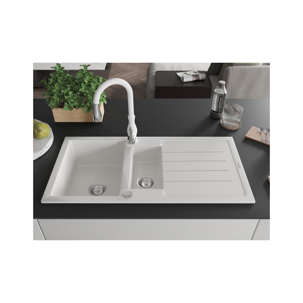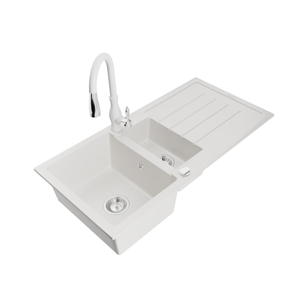 Mexen Andres, 1,5-komorový granitový dřez 1000x500x200 mm a dřezová baterie Savita, bílá, 6515-20-672601-20