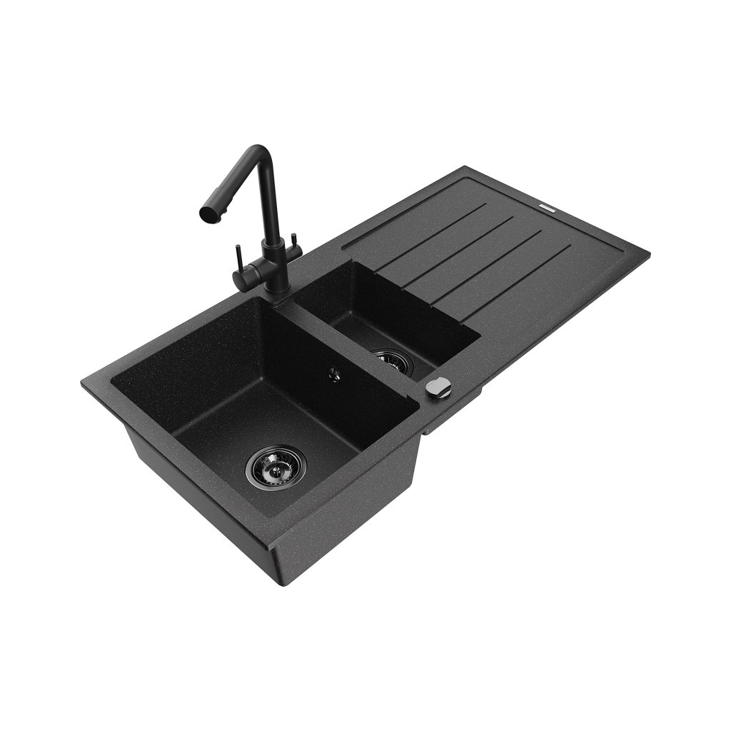 Mexen Andres, granitový dřez 1000x500x200 mm, 1,5-komorový + černá baterie Duero, černá-stříbrná metalíza, 6515-73-671600-70-B