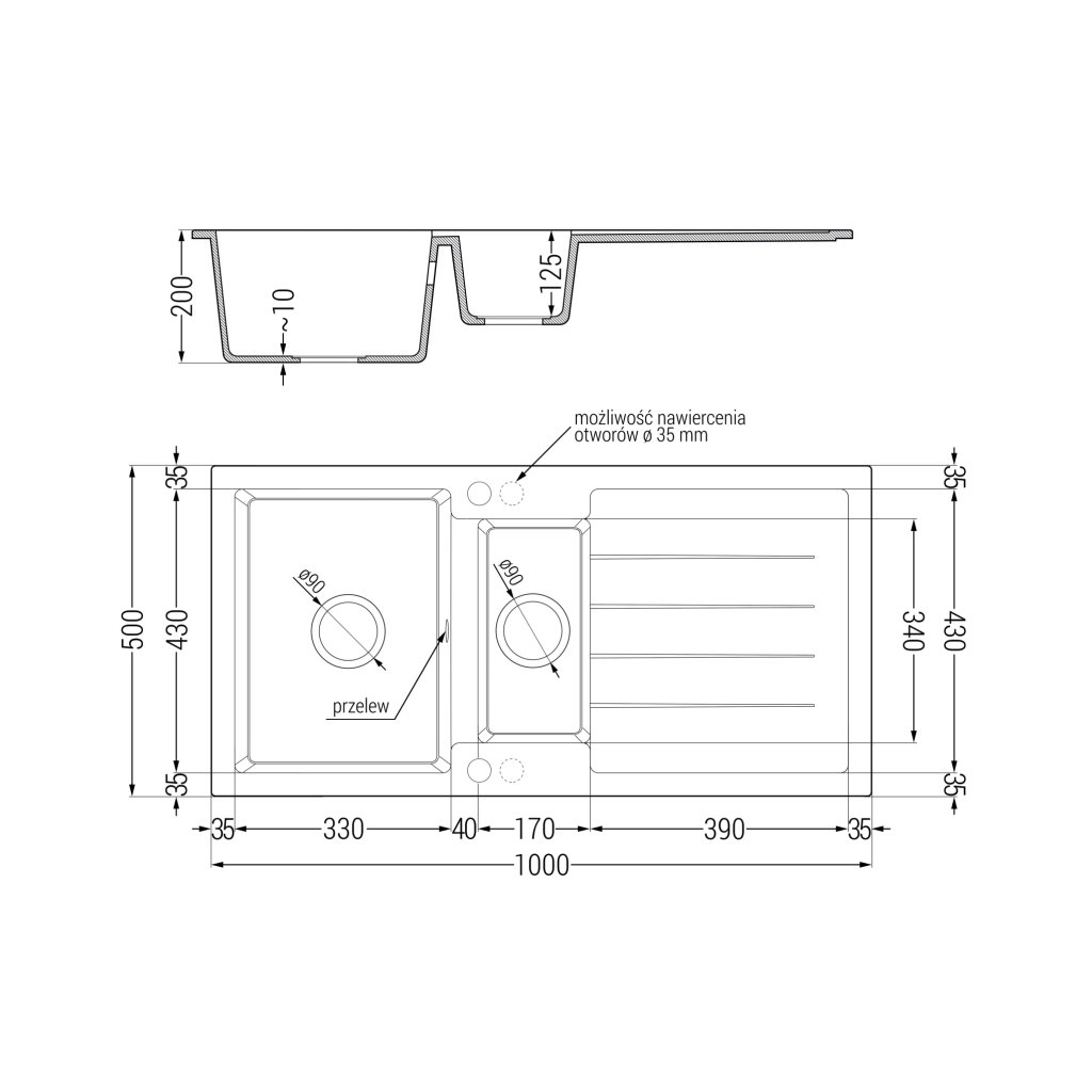 - Odtokový otvor: 3,5 ”; fi = 90 mm