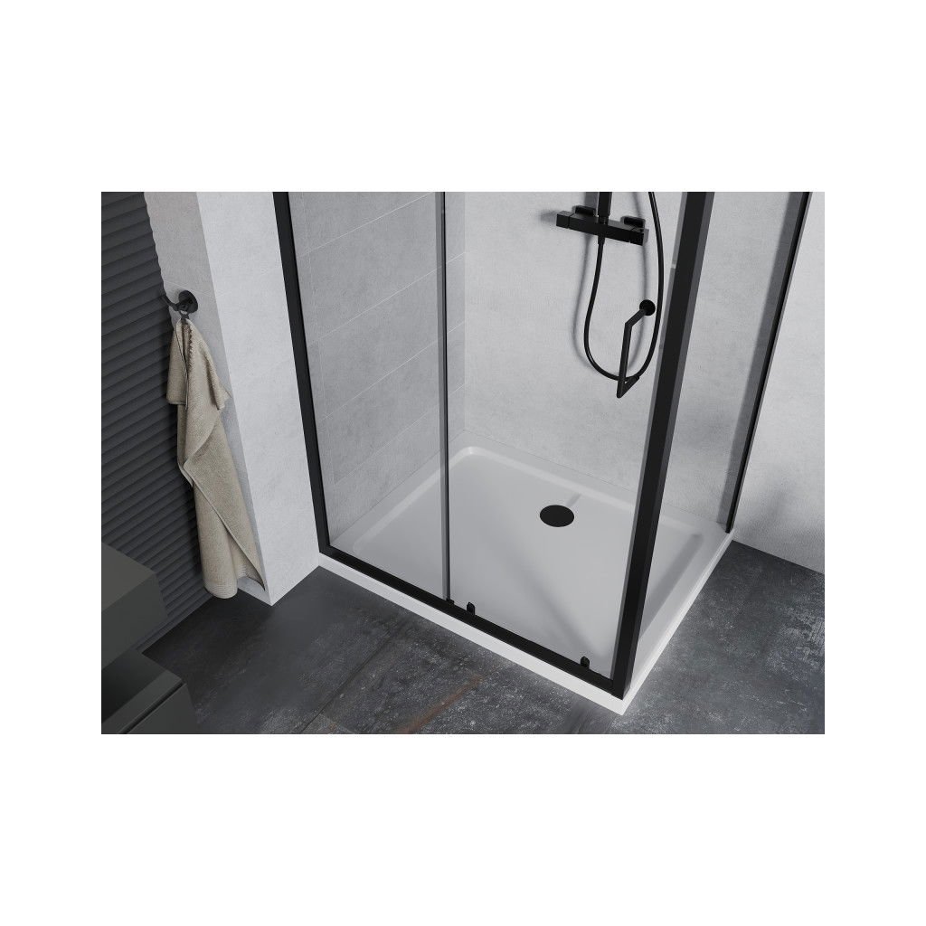 Sprchový kout ze série Mexen Apia je skvělá volba vyrobená z 5mm tvrzeného skla v čirém provedení. Sprchové posuvné dveře obsahují spolehlivá dvojitá kolečka, která zaručují hladké a tiché posouvání. K otevírání slouží decentní kovová rukojeť. Speciální potah na skle usnadňuje jeho mytí a umožňuje vám tak si užít dokonale průhledné a lesklé sklo déle. Tvrzené a bezpečné sklo a prvky povrchové úpravy dveří byly vyrobeny z nerezavějícího materiálu potaženého černou matnou barvou. Hliníkový profil s prahem zaručuje dokonalou těsnost. Instalace je možná na sprchovou vaničku, která je součástí nabízené sady. Osazení sprchového koutu je univerzální, v levém nebo pravém provedení.