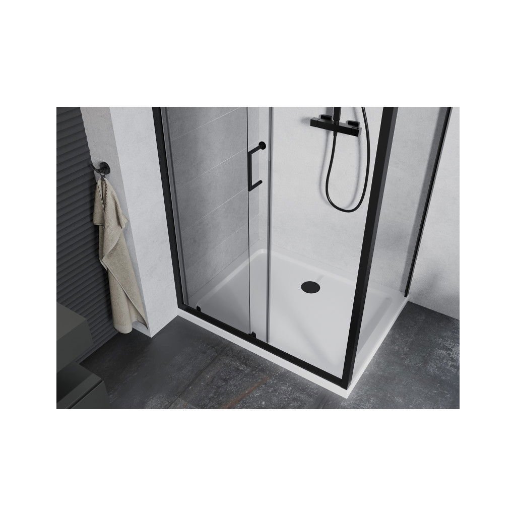 Sprchový kout ze série Mexen Apia je skvělá volba vyrobená z 5mm tvrzeného skla v čirém provedení. Sprchové posuvné dveře obsahují spolehlivá dvojitá kolečka, která zaručují hladké a tiché posouvání. K otevírání slouží decentní kovová rukojeť. Speciální potah na skle usnadňuje jeho mytí a umožňuje vám tak si užít dokonale průhledné a lesklé sklo déle. Tvrzené a bezpečné sklo a prvky povrchové úpravy dveří byly vyrobeny z nerezavějícího materiálu potaženého černou matnou barvou. Hliníkový profil s prahem zaručuje dokonalou těsnost. Instalace je možná na sprchovou vaničku, která je součástí nabízené sady. Osazení sprchového koutu je univerzální, v levém nebo pravém provedení.