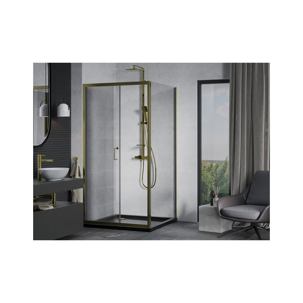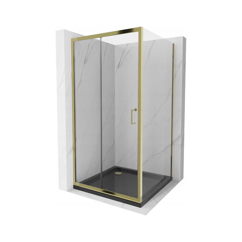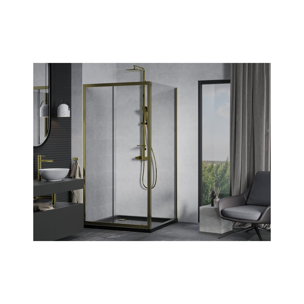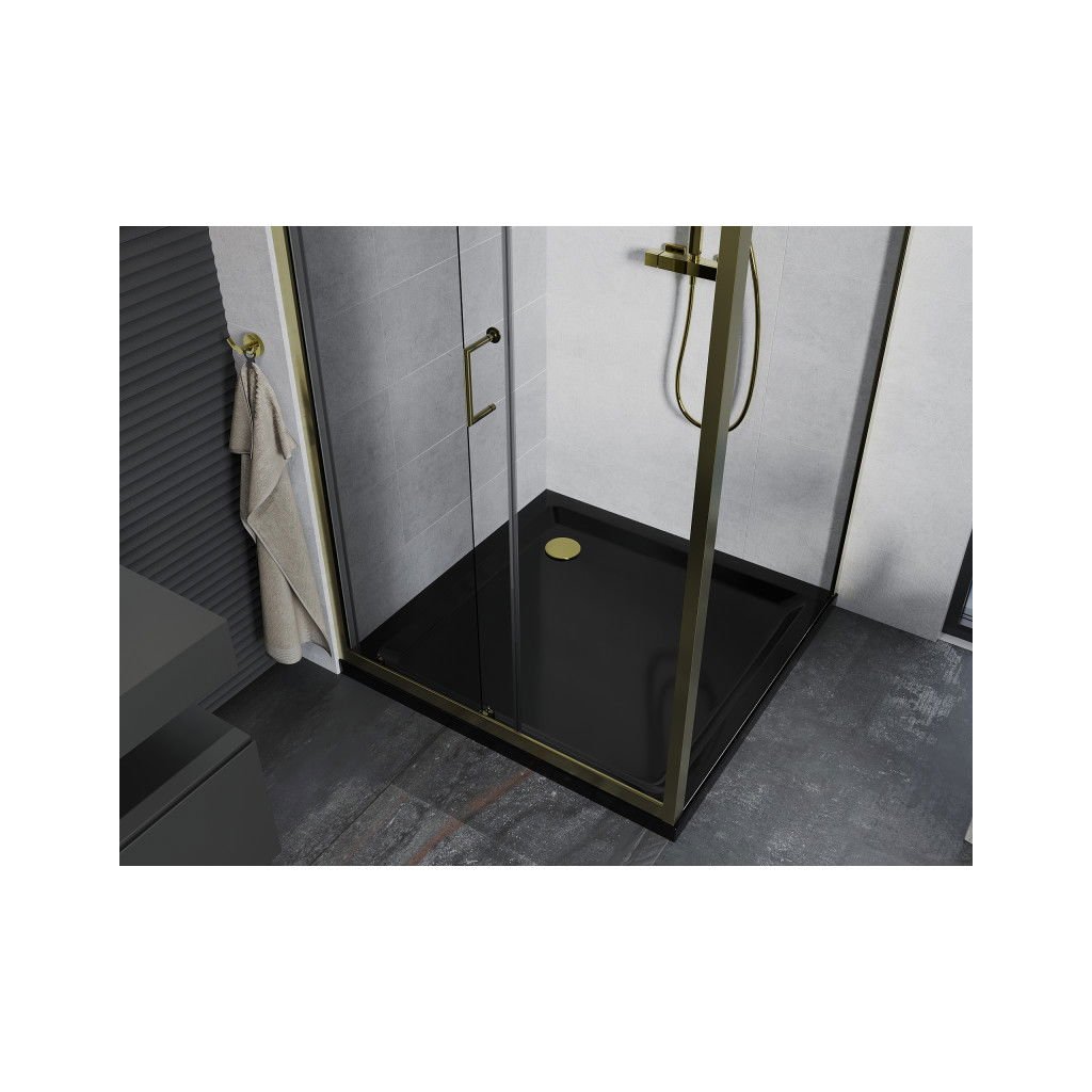 Mexen Apia sprchový kout s posuvnými dveřmi 100 (dveře) x 100 (stěna) cm, 5mm čiré sklo, zlatý profil + černá sprchová vanička SLIM, 840-100-100-50-00-4070G