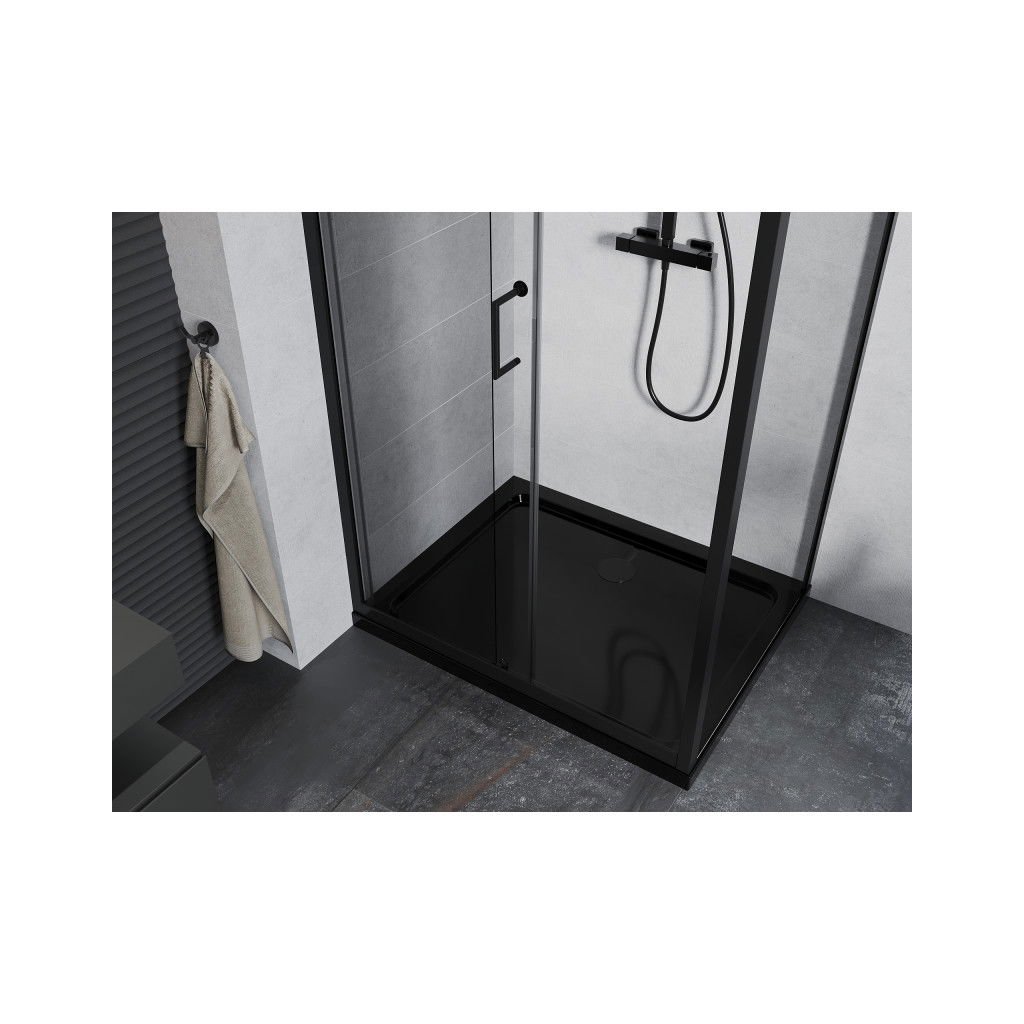 Mexen Apia sprchový kout s posuvnými dveřmi 100 (dveře) x 70 (stěna) cm, 5mm čiré sklo, černý profil + černá sprchová vanička s černým sifonem, 840-100-070-70-00-4070B