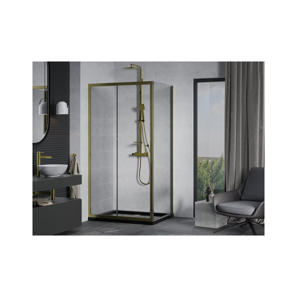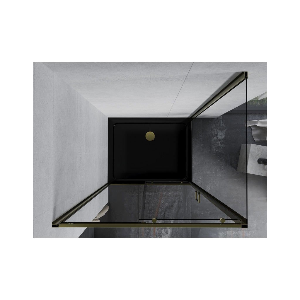 Mexen Apia sprchový kout s posuvnými dveřmi 100 (dveře) x 80 (stěna) cm, 5mm čiré sklo, zlatý profil + černá sprchová vanička SLIM, 840-100-080-50-00-4070G