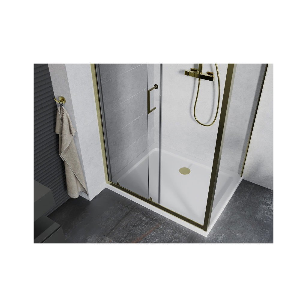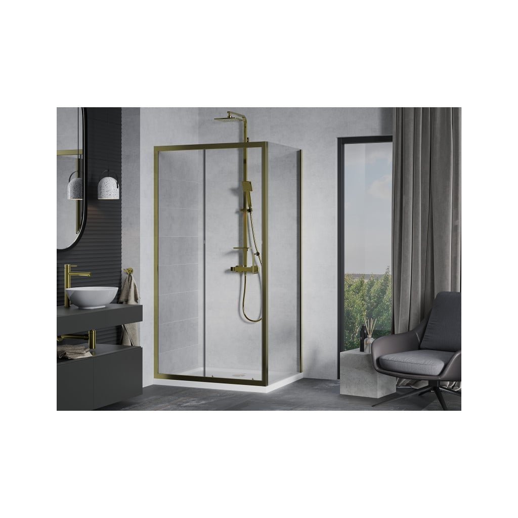 Mexen Apia sprchový kout s posuvnými dveřmi 110 (dveře) x 80 (stěna) cm, 5mm čiré sklo, zlatý profil + bílá sprchová vanička SLIM, 840-110-080-50-00-4010G