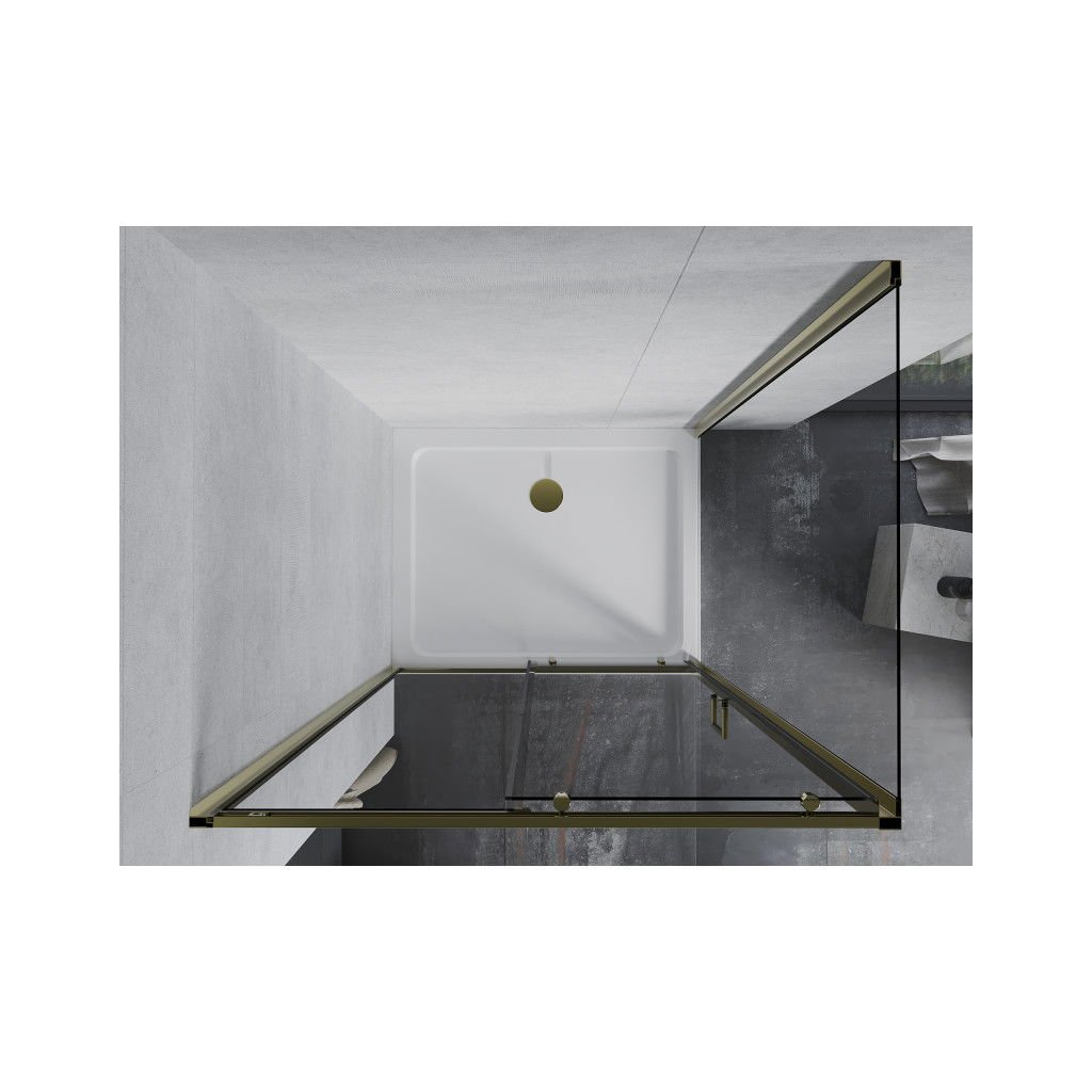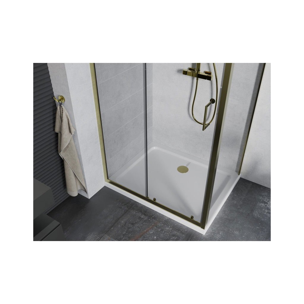 Mexen Apia sprchový kout s posuvnými dveřmi 110 (dveře) x 90 (stěna) cm, 5mm čiré sklo, zlatý profil + bílá sprchová vanička SLIM, 840-110-090-50-00-4010G