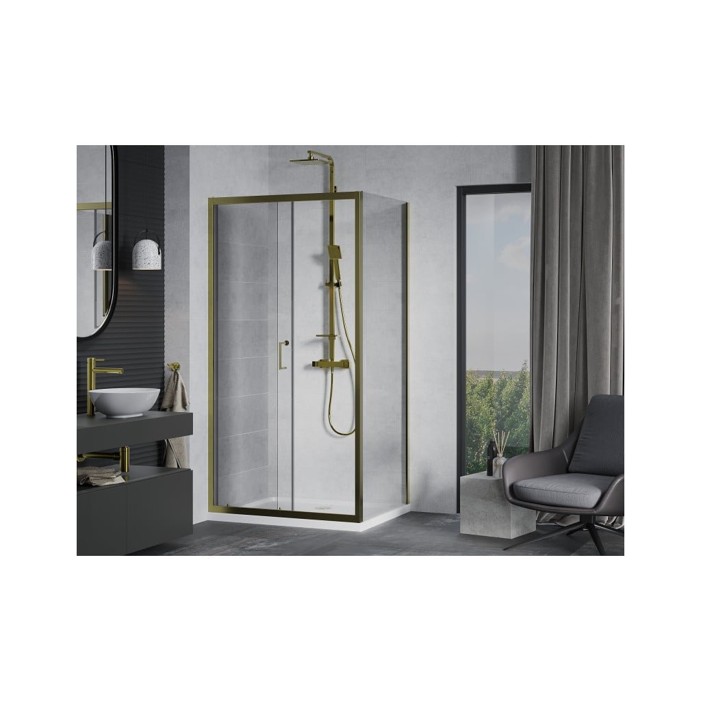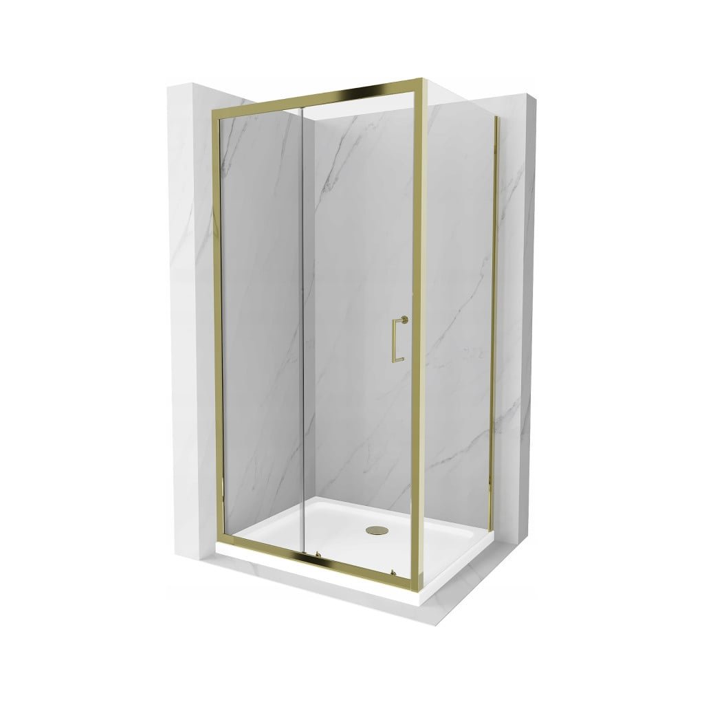 Mexen Apia sprchový kout s posuvnými dveřmi 140 (dveře) x 100 (stěna) cm, 5mm čiré sklo, zlatý profil + bílá sprchová vanička SLIM, 840-140-100-50-00-4010G
