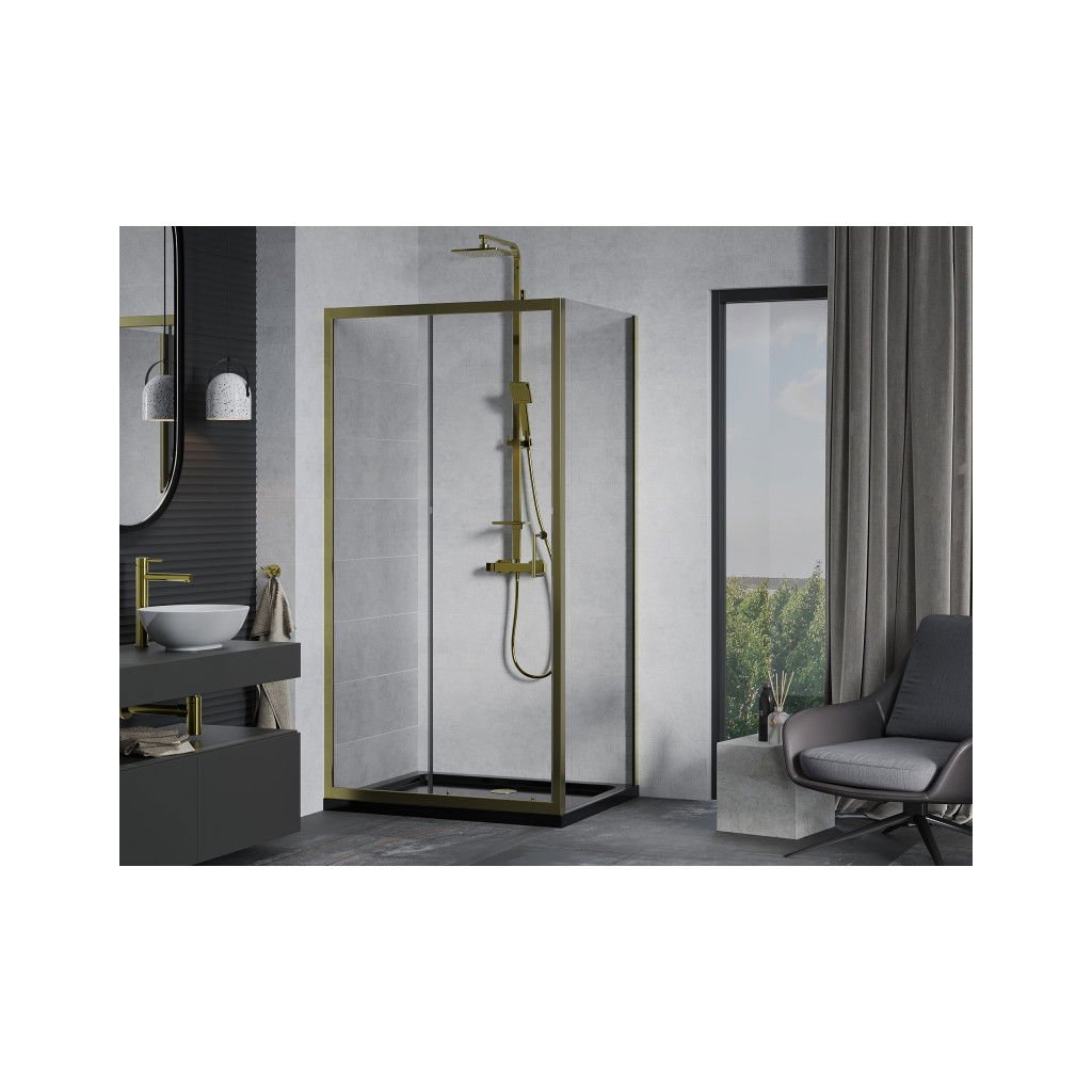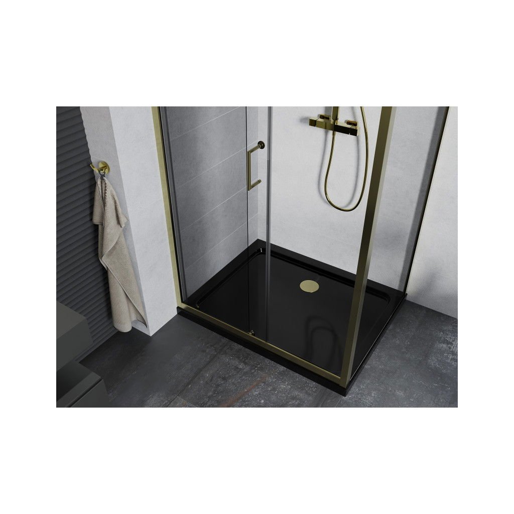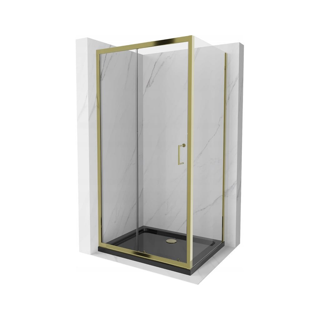 Mexen Apia sprchový kout s posuvnými dveřmi 140 (dveře) x 100 (stěna) cm, 5mm čiré sklo, zlatý profil + černá sprchová vanička SLIM, 840-140-100-50-00-4070G