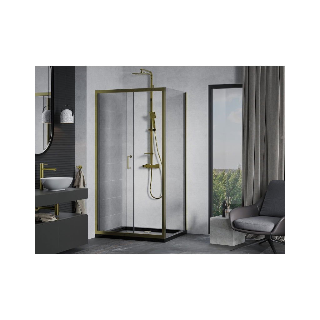 Mexen Apia sprchový kout s posuvnými dveřmi 140 (dveře) x 70 (stěna) cm, 5mm čiré sklo, zlatý profil + černá sprchová vanička SLIM, 840-140-070-50-00-4070G