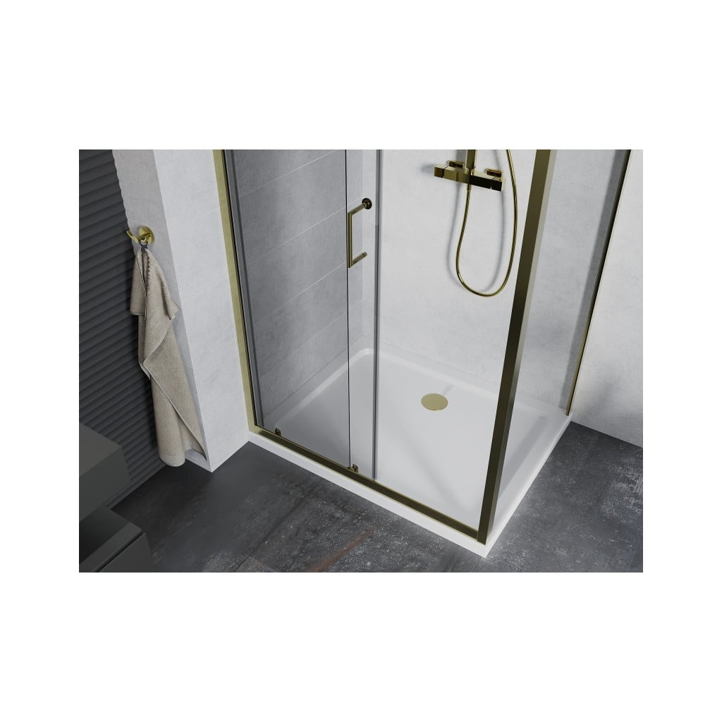 Mexen Apia sprchový kout s posuvnými dveřmi 140 (dveře) x 80 (stěna) cm, 5mm čiré sklo, zlatý profil + bílá sprchová vanička SLIM, 840-140-080-50-00-4010G