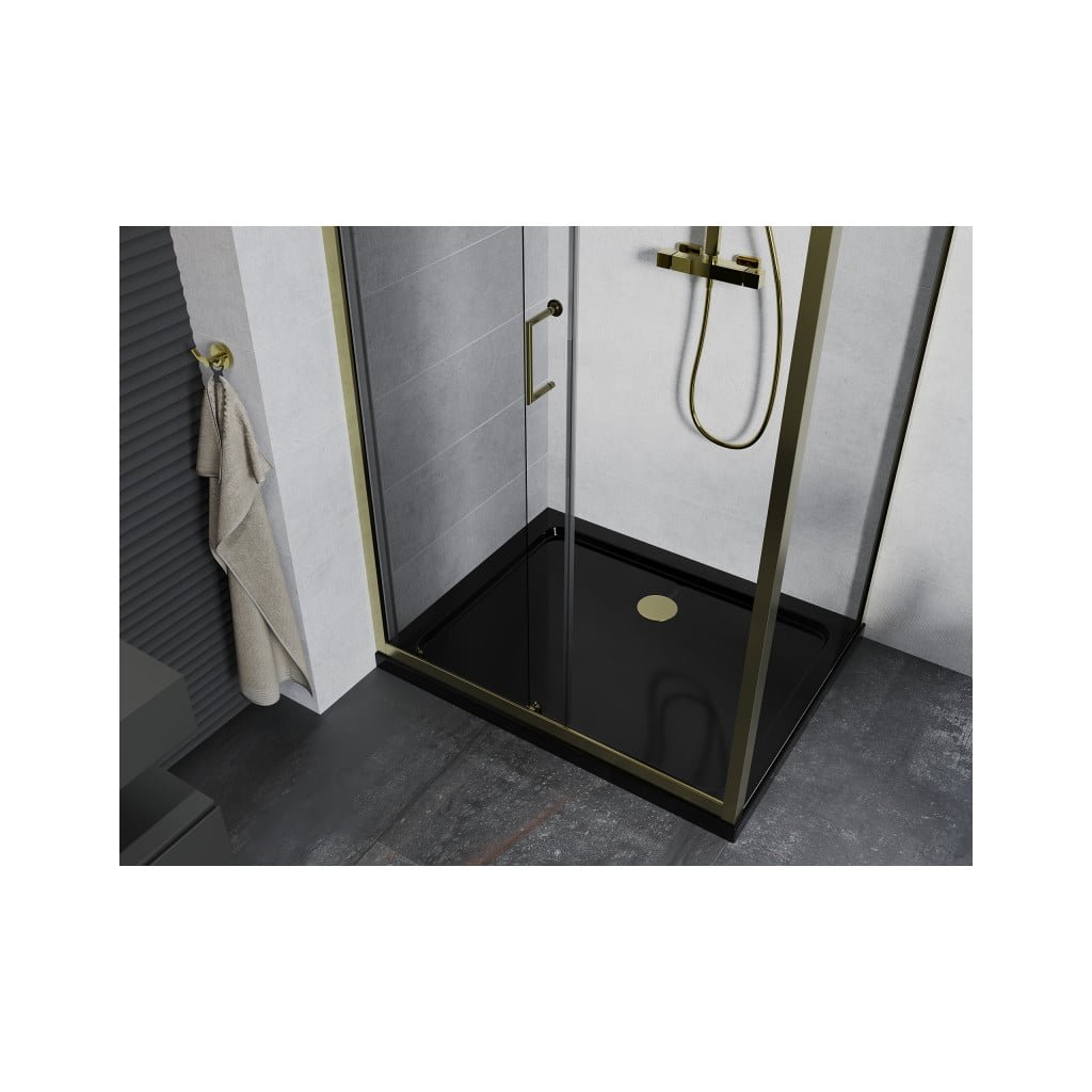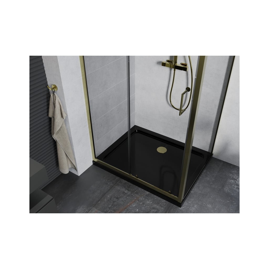 Mexen Apia sprchový kout s posuvnými dveřmi 90 (dveře) x 100 (stěna) cm, 5mm čiré sklo, zlatý profil + černá sprchová vanička SLIM, 840-090-100-50-00-4070G