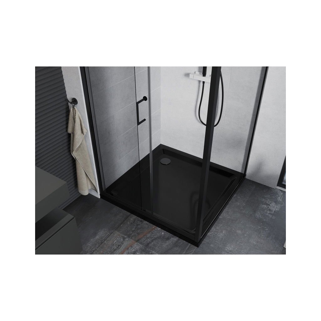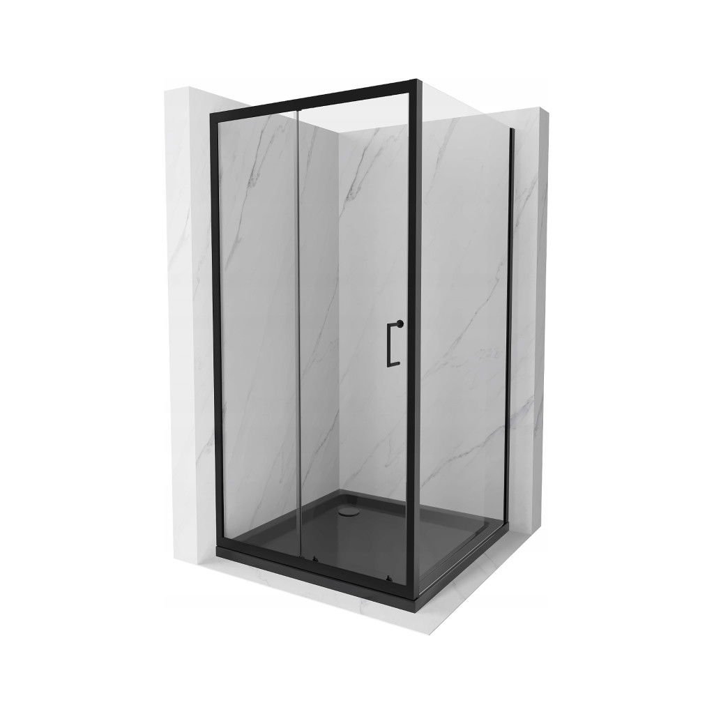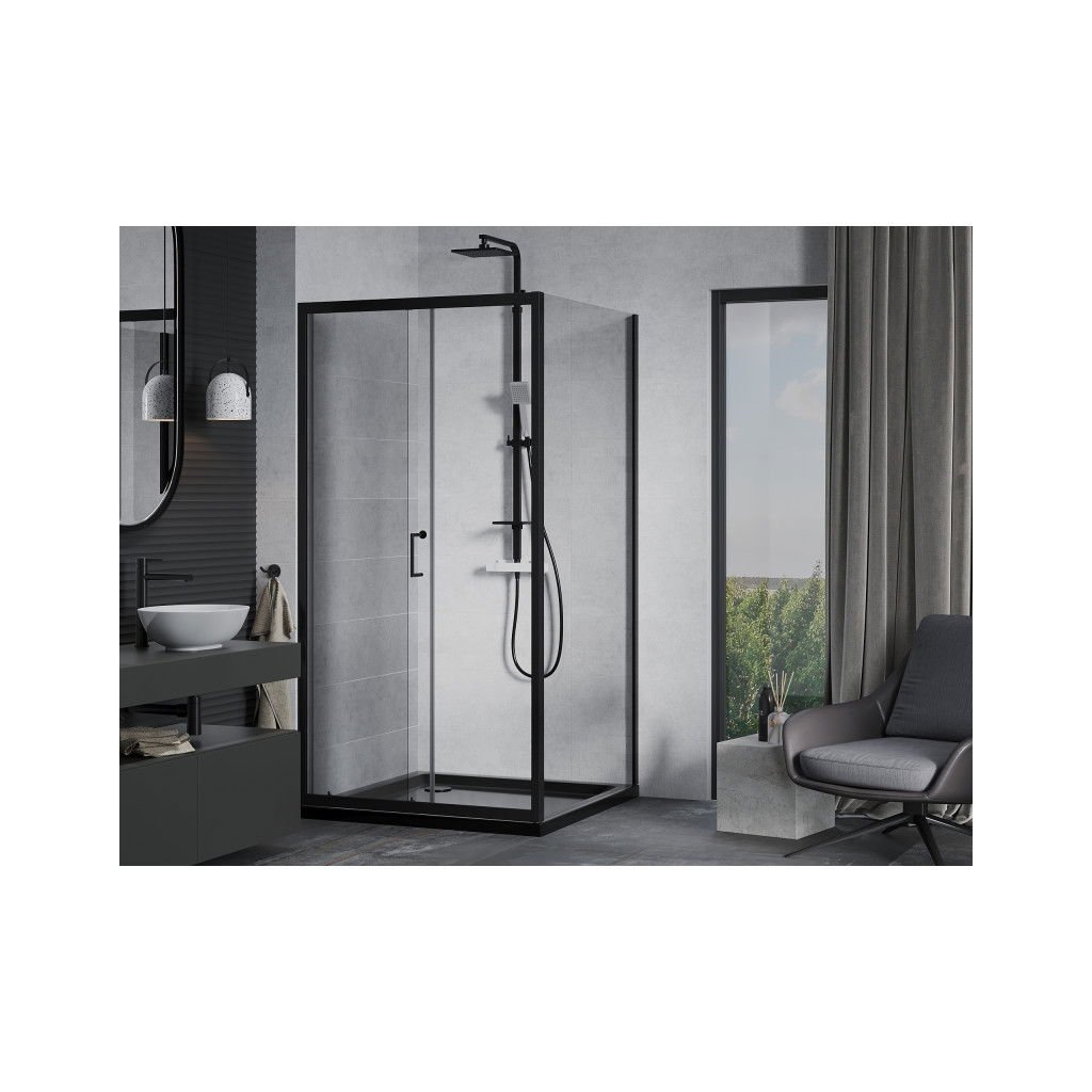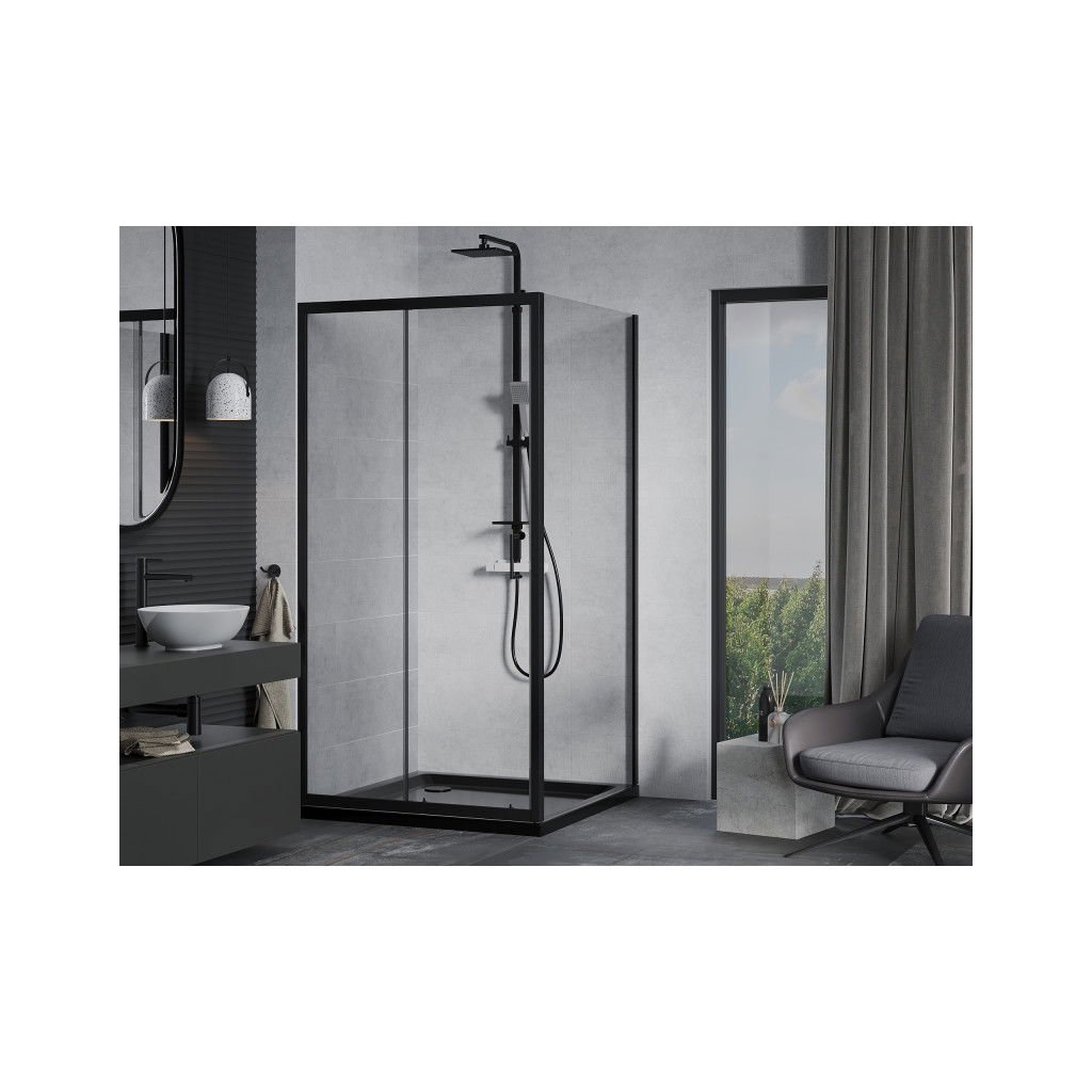 Mexen Apia sprchový kout s posuvnými dveřmi 90 (dveře) x 90 (stěna) cm, 5mm čiré sklo, černý profil + černá sprchová vanička s černým sifonem, 840-090-090-70-00-4070B