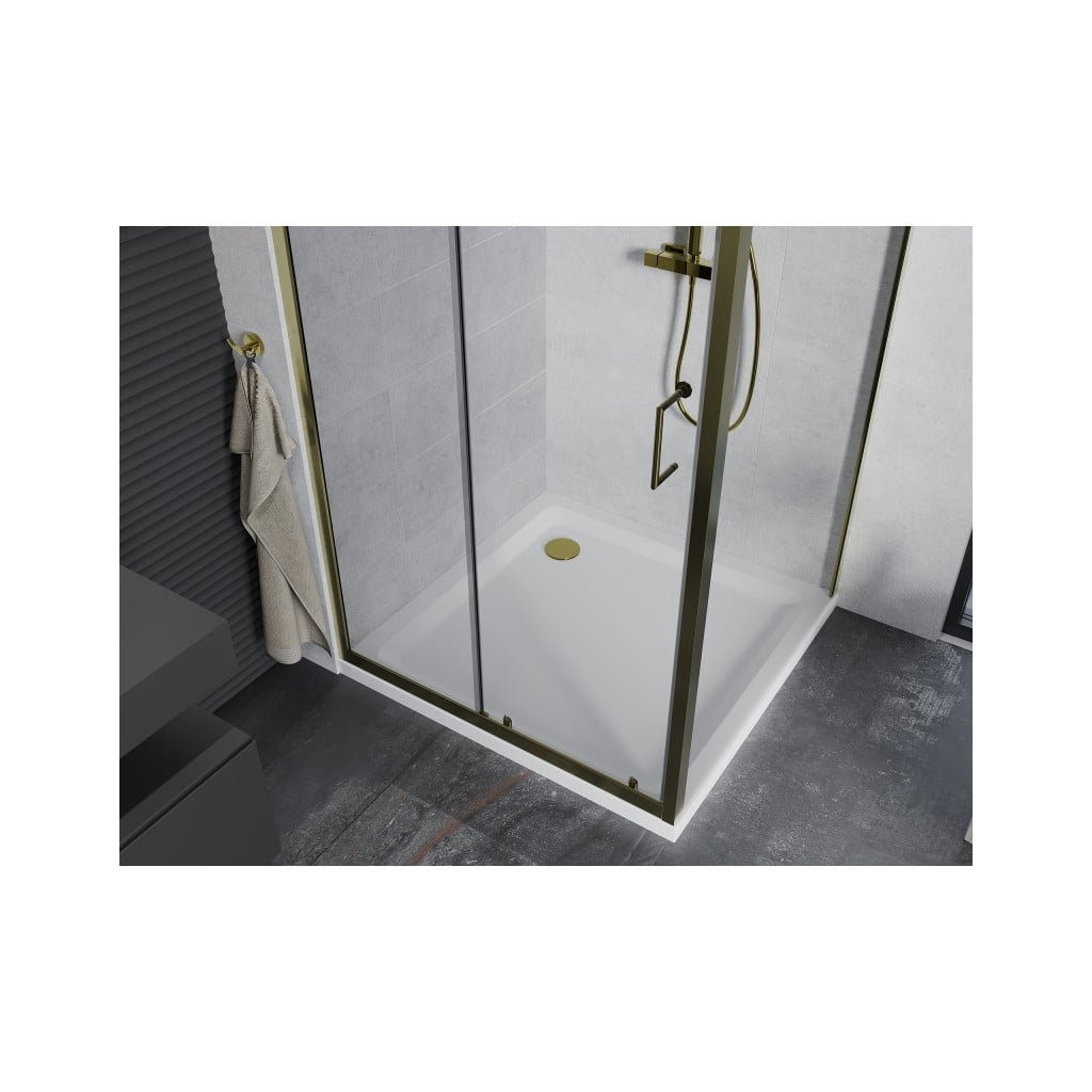 Mexen Apia sprchový kout s posuvnými dveřmi 90 (dveře) x 90 (stěna) cm, 5mm čiré sklo, zlatý profil + bílá sprchová vanička SLIM, 840-090-090-50-00-4010G