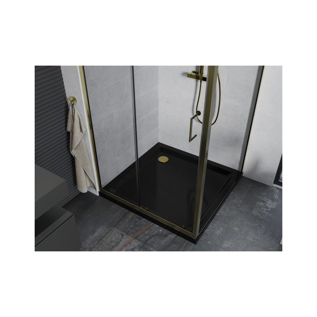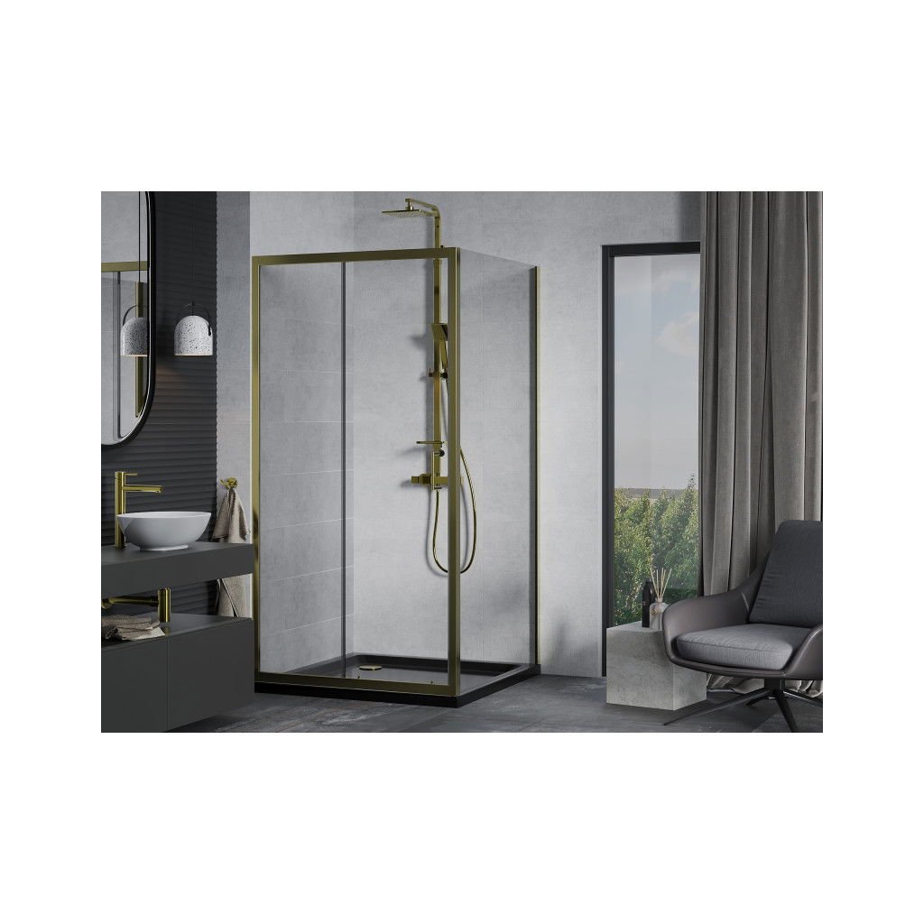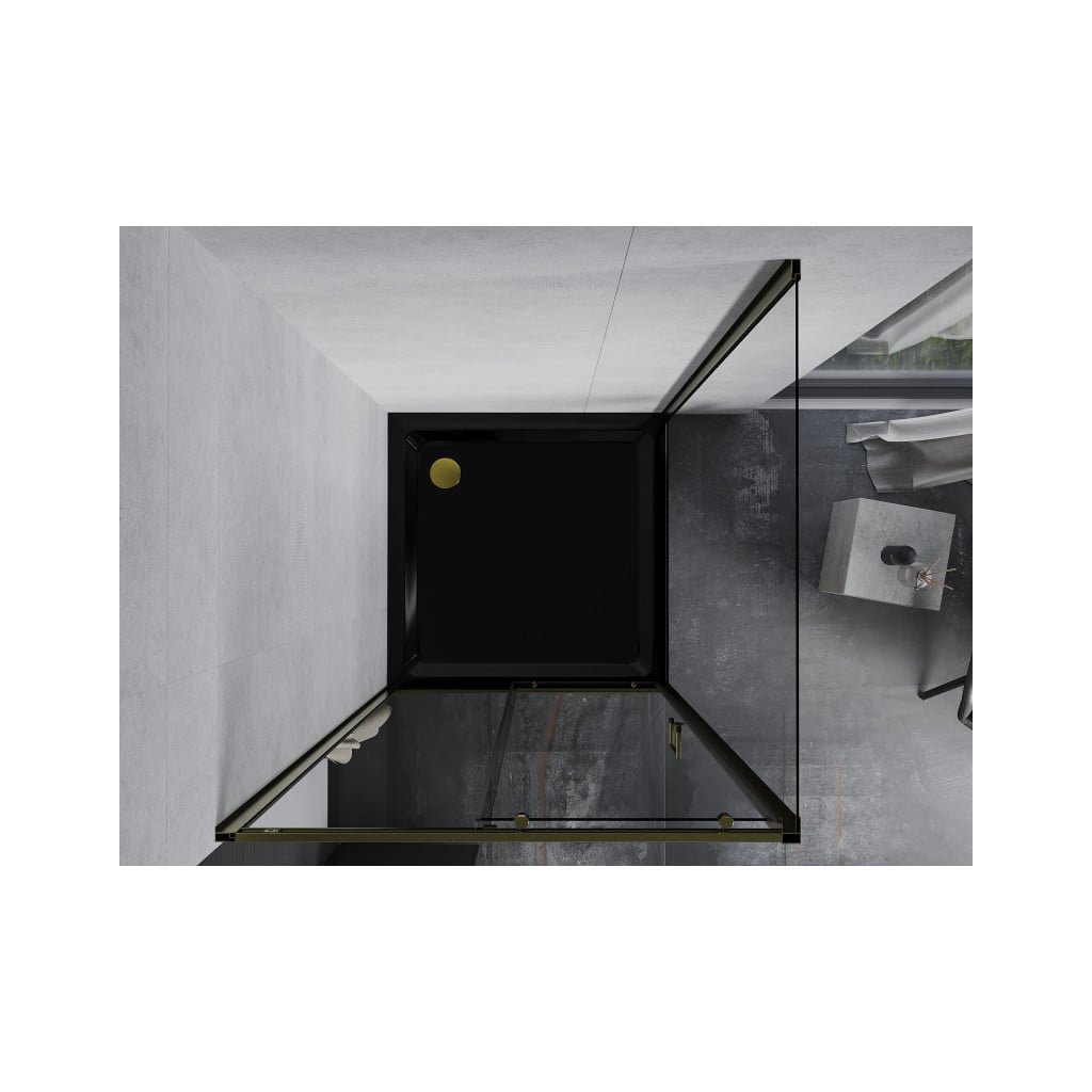 Mexen Apia sprchový kout s posuvnými dveřmi 90 (dveře) x 90 (stěna) cm, 5mm čiré sklo, zlatý profil + černá sprchová vanička SLIM, 840-090-090-50-00-4070G