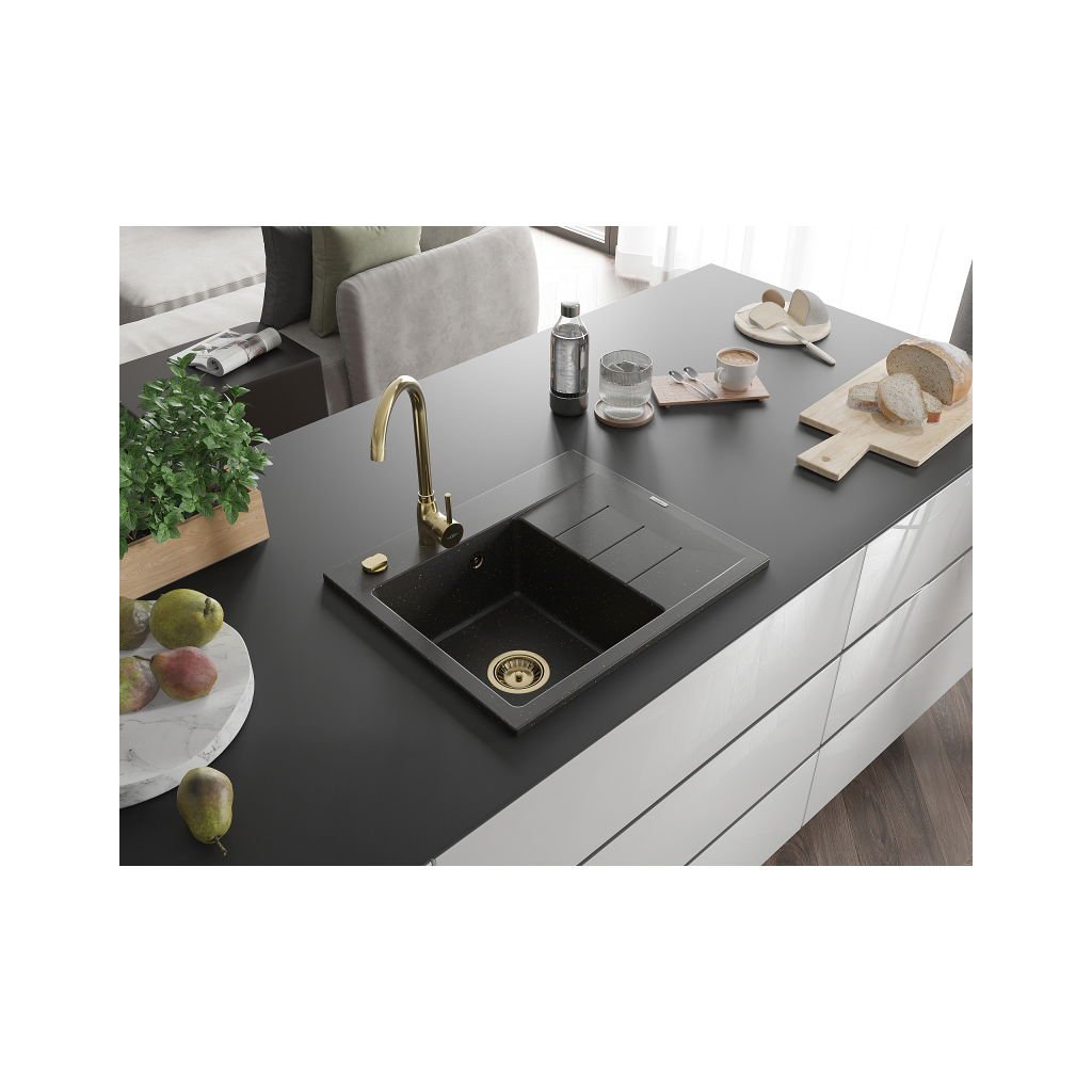 Mexen Ben, 1-komorový granitový dřez 600x500x190 mm, levý + zlatý sifon, černá-zlatá metalíza, 6522605000-75-G