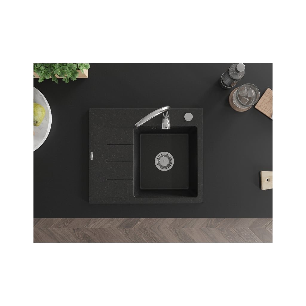 Mexen Ben, 1-komorový granitový dřez 600x500x190 mm, pravý + chromový sifon, černá-stříbrná metalíza, 6523605000-73