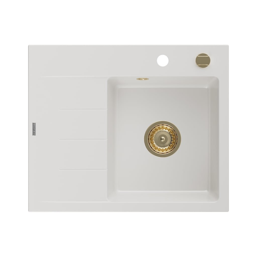 Mexen Ben, 1-komorový granitový dřez 600x500x190 mm, pravý + zlatý sifon, bílá, 6523605000-20-G