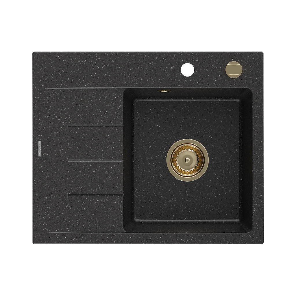 Mexen Ben, 1-komorový granitový dřez 600x500x190 mm, pravý + zlatý sifon, černá-stříbrná metalíza, 6523605000-73-G