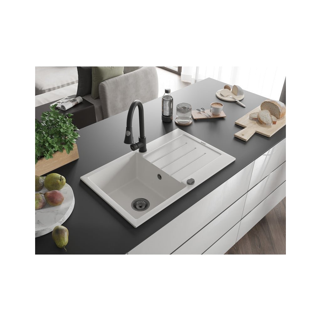 Mexen Bruno, 1-komorový granitový dřez 795x495x200 mm a dřezová baterie Elia, bílá, 6513-20-670101-70